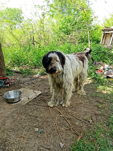 Bobo lebte mit 12 anderen Hunden an einer Kette auf einem vermüllten Grundstück. Als der Fall bekannt wurde, kamen alle Hunde ins Tierheim. Er ist der letzte der 13 Hunde, alle anderen sind schon lange vermittelt.