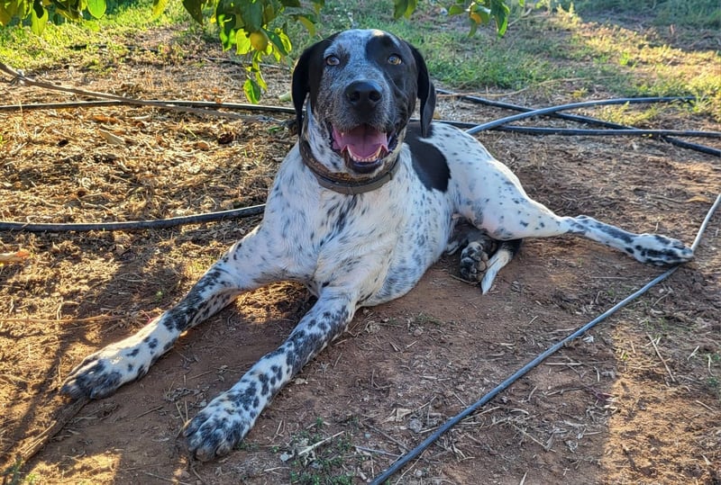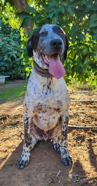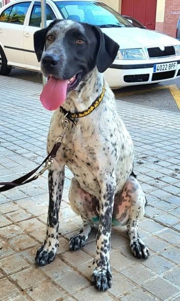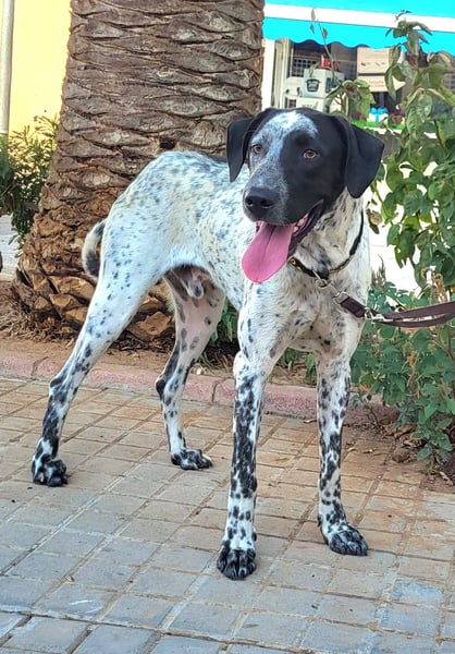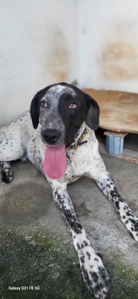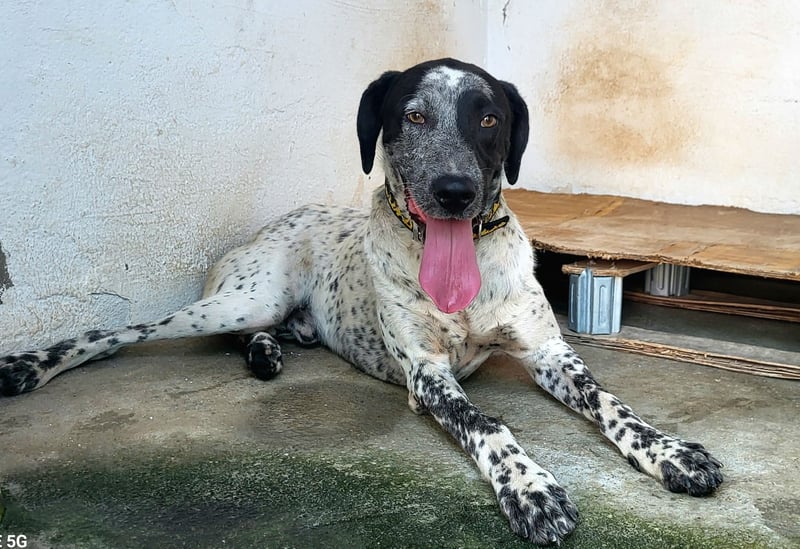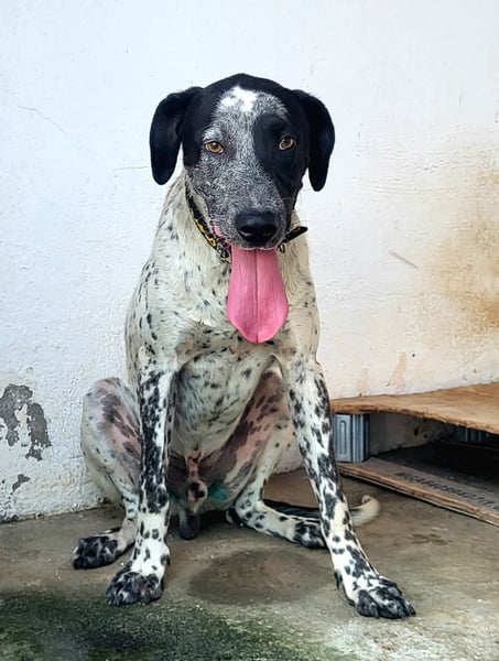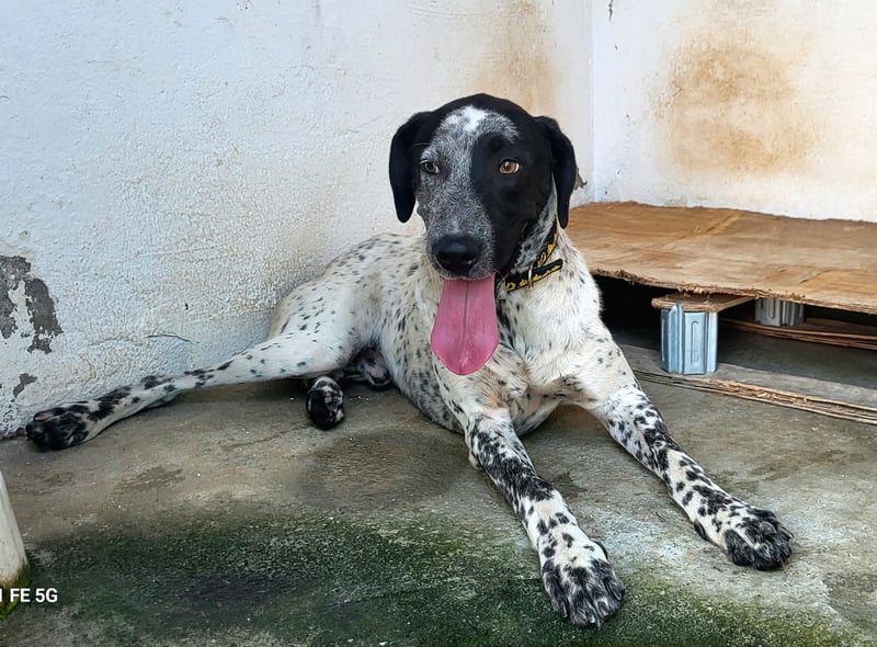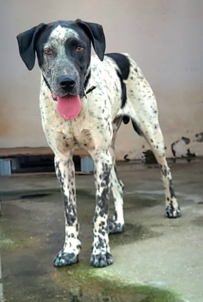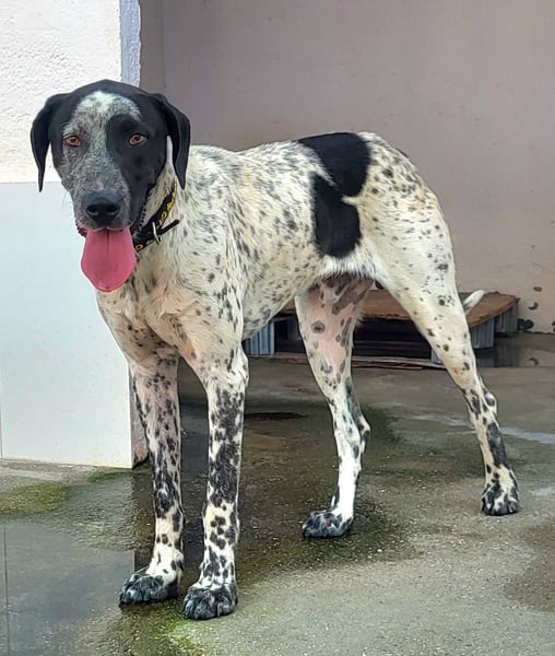 CAPITAN (ca. 1 Jahr, 67 cm, 31,8 kg) ist ein wunderschöner, junger Mischlings Rüde und voller Lebensfreude. Mit seinem schwarz-weiß gesprenkelten Fell und den ausdrucksstraken, bernsteinfarbenen Augen zieht er sofort alle Blicke auf sich.