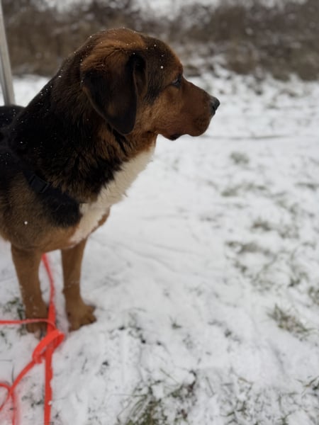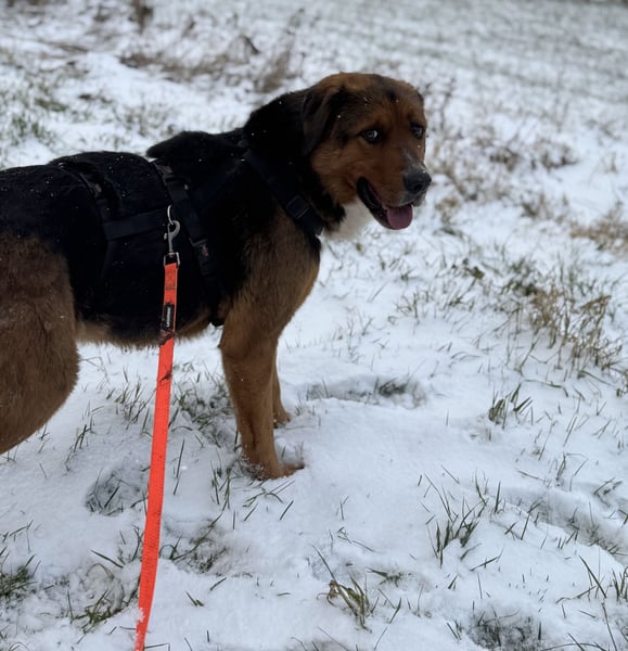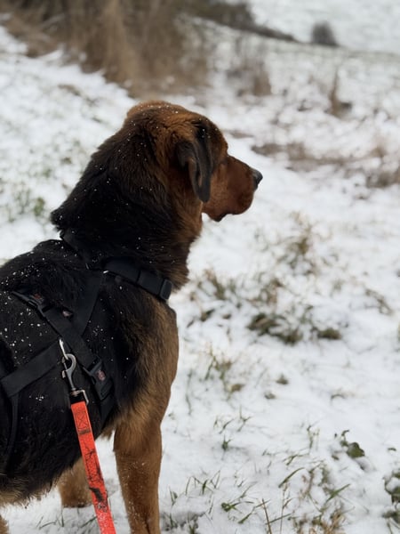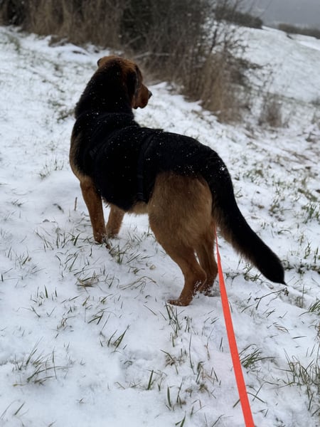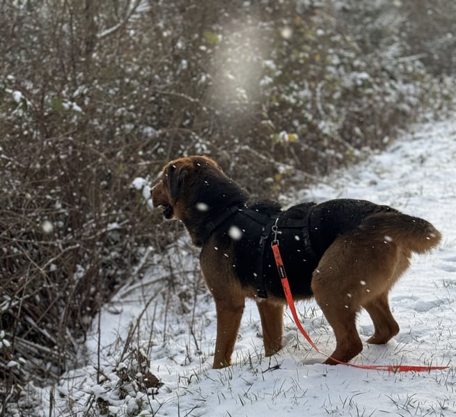 Nyra hört gut auf ihren Namen und auch der Rückruf an der Schleppleine klappt schon sehr gut, selbst bei Ablenkung. Natürlich muss sie erst noch die Schulbank drücken und lernen was Leinenführigkeit bedeutet, aber trotz ihrer Größe ist sie gut zu händeln, selbst wenn sie mal ein bisschen zieht. Da bringen kleinere Vertreter ihrer Art deutlich mehr Druck auf die Leine. Sie legt zudem ein normales Aktivitätsniveau an den Tag und braucht keine stundenlangen Spaziergänge. Auch umweltsicher ist sie - vorbeirasende LKW und Autos machen ihr nichts aus.