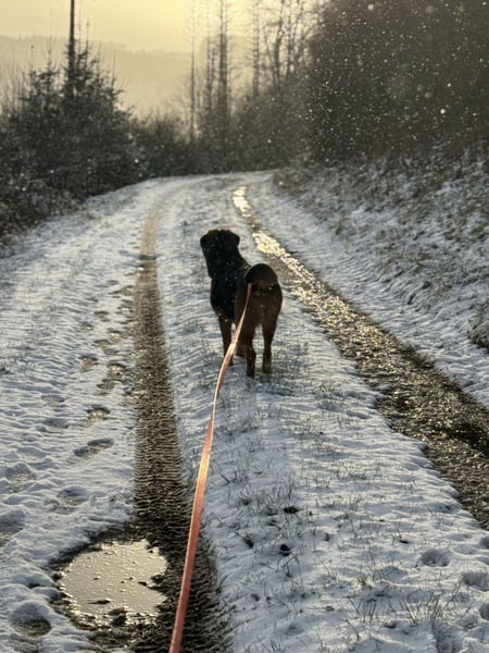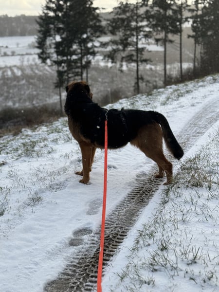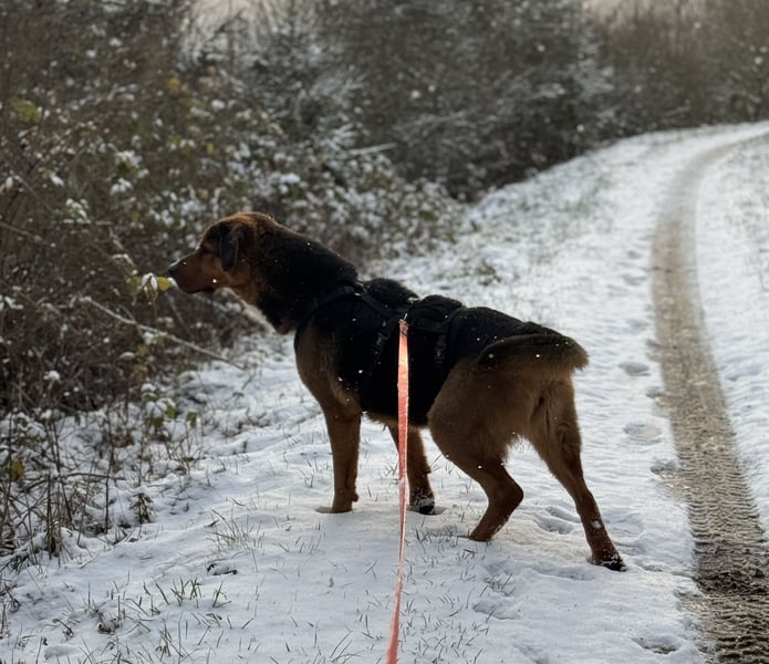 Es ist eine Freude mit Nyra spazieren zu gehen. Sie erkundet ihre Umgebung ganz neugierig, und wenn ihr mal etwas anfänglich nicht ganz Geheuer ist (wie Rehfiguren aus Metall in Vorgärten), sucht sie die Nähe des Leinenführers und traut sich dann mutig vorbei. Sobald die erste Power raus ist, liebt sie es zudem sich zwischendurch Streicheleinheiten abzuholen. Die hat sie in der Vergangenheit bestimmt viel zu wenig bekommen.