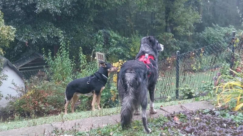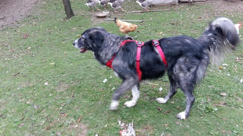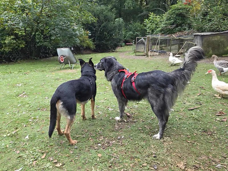 Hier bin ich auf meiner Pflegestelle bei Carlo, Olivia, meinem Pflegepapa und vielen anderen Tieren, wie Katzen, Hühnern, Enten, Gänsen. Zu allen bin ich voll lieb und lasse auch ihnen ihren Freiraum. Nun ja, mit Olivia muss ich mich noch ein wenig besser anfreunden.