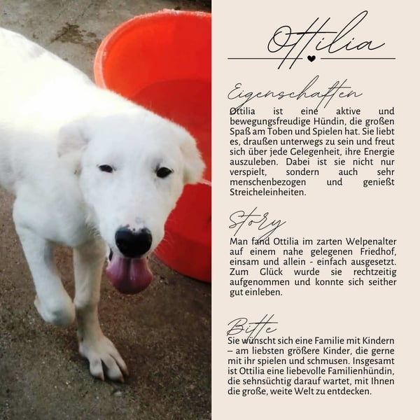 Wir freuen uns, wenn OTTILIA bald eine liebevolle Familie findet, die ihr die Wärme und Geborgenheit schenkt, die sie verdient.