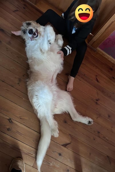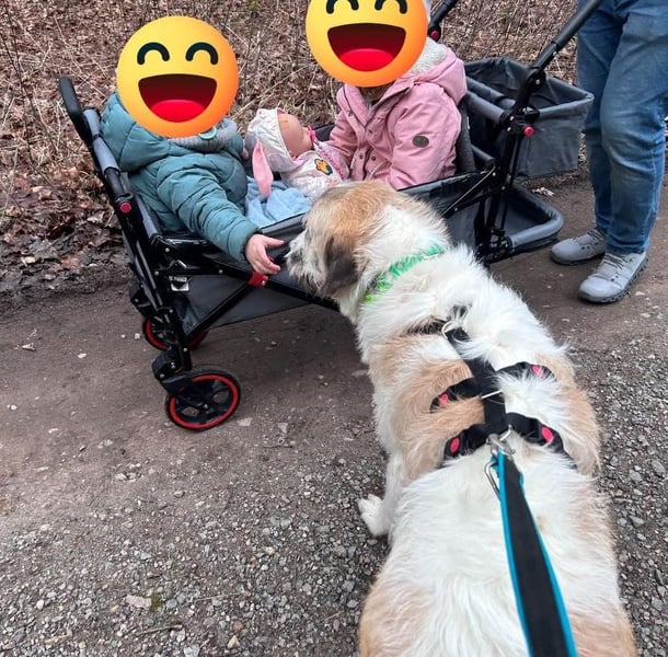 Hier hat sie das Leben im Familienalltag auch mit Kindern (hier 6-15 Jahre) kennengelernt. Fussel zeigt sich den Kindern offen gegenüber; im besten Fall sind Kinder aufgrund ihrer Größe schon standfest.