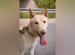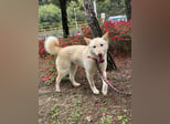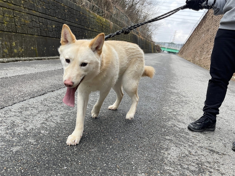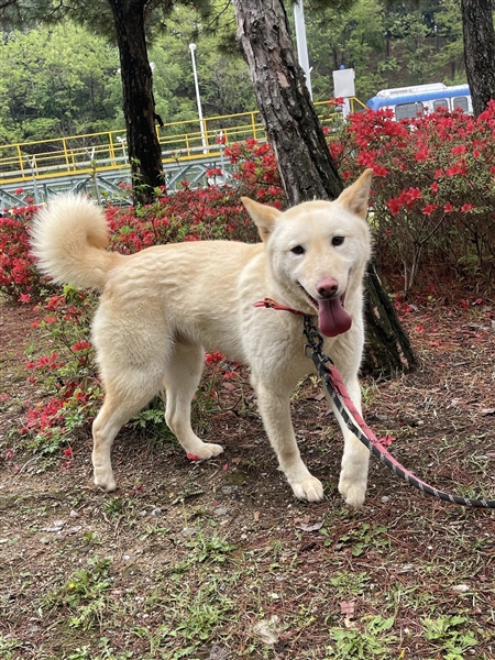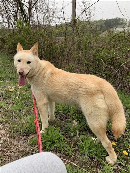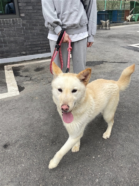 Booyong ist ein männlicher Jindo-Mischlingshund mit einem wunderschönen cremefarbenen Fell. Er kam im März 2021, im Alter von nur wenigen Monaten, in unser Schwestertierheim, das Yongin Pound.