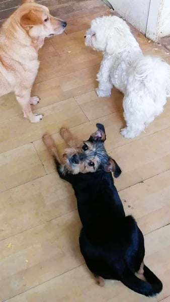 Er ist ein durchweg freundlicher Gesell, der gerne mit den anderen Hunden um die Wette rennt, wer mag es ihm verdenken, schließlich ist er noch ganz jung.