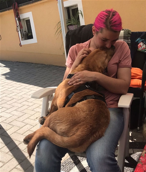 Er fährt gerne Auto, ist während der Fahrt ruhig und er liebt seine Box. Er freut sich, wenn ich sein Geschirr in die Hand nehme, weil er gelernt hat, dass wir dann spazieren gehen.