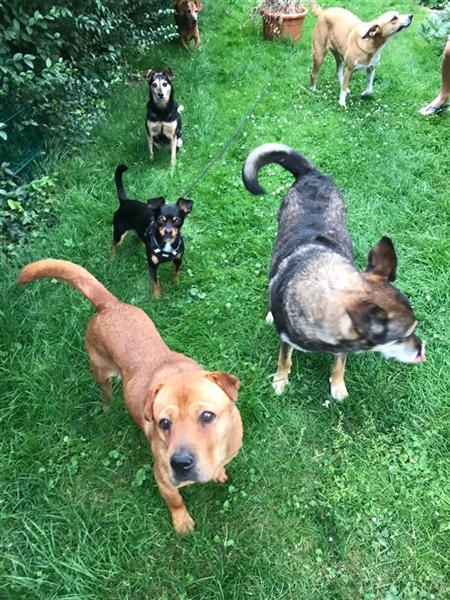 Mosci zeigt sich auf ihrer Pflegestelle, die sie sich mit zwei Rüden und einer Hündin problemlos teilt, vorbildlich.