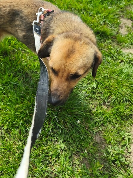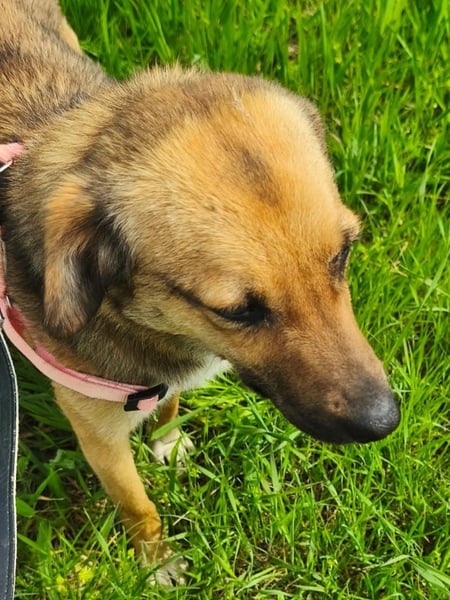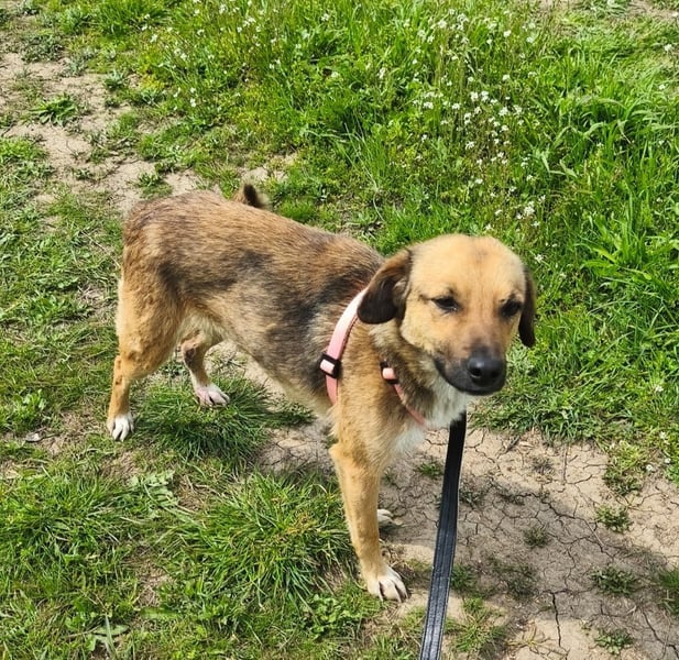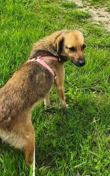 Nun wird die dünne Hundedame erst mal gefüttert und gepäppelt. Noch kann sie verständlicherweise ihr Glück gar nicht fassen und schaut vorsichtig drein, aber ist freundlich und zutraulich - es kann ja schließlich alles nur besser werden!
