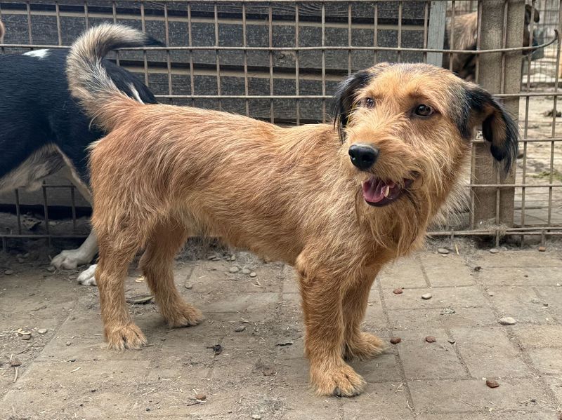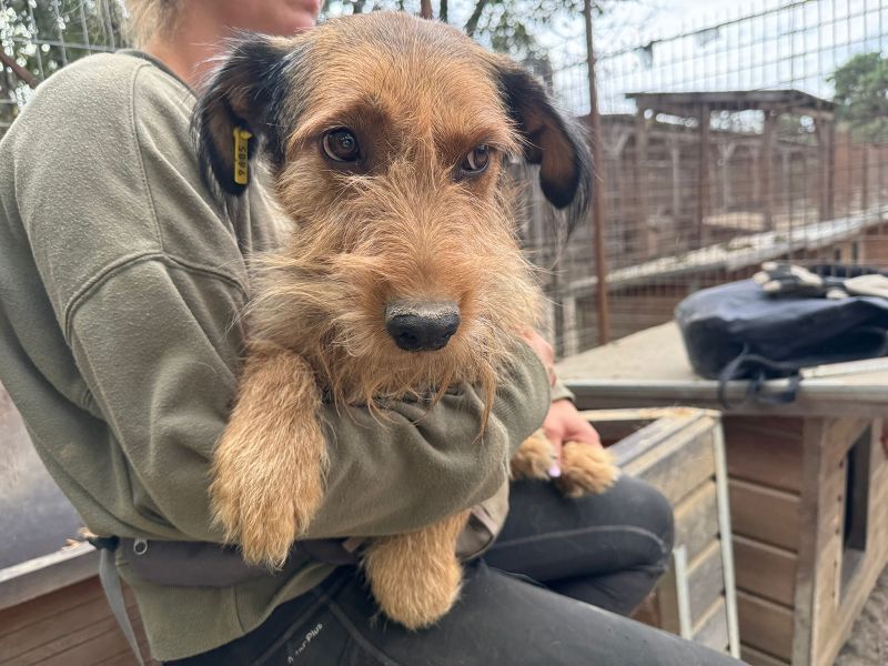 Der 38 cm kleine Forrest ist ein Rüde, der mit seinem drahthaarigen Fell und seinem langen Körper sofort ins Auge fällt. Seit dem Sommer 2023 lebt er bereits im Tierheim Bucov/Ruänien zwischen 5000 weiteren Hunden. Er galt unter den Besuchern immer als „nicht anfassbar“. Als wir ihn im September 2025 in seinen Gruppenzwinger gingen und ihn in der Hütte fanden, konnten wir ihn behutsam herausheben – er ließ es über sich ergehen, ohne sich zu wehren, auch wenn man ihm die Unsicherheit deutlich anmerkte. Auf dem Schoß blieb er ruhig und ließ sich vorsichtig streicheln, auch wenn Nähe für ihn noch ungewohnt ist. Forrest hatte in jedem Fall seit zwei Jahren niemand mehr gestreichelt. Wer weiß er das zuvor überhaupt mal erlebt hat. So eine lange Zeit ohne liebevolle Zuwendung hat Spuren hinterlassen – seine Zurückhaltung ist verständlich. Dennoch zeigte er in seinem Blick und Verhalten, dass er nicht aufgegeben hat. Für diesen sensiblen kleinen Hundemann wünschen wir uns Menschen mit Geduld und Einfühlungsvermögen, die ihm zeigen, dass Berührungen nichts Schlimmes, sondern etwas Schönes sein können. In einem ruhigen Zuhause, gerne mit einem souveränen Ersthund an seiner Seite, wird Forrest mit Sicherheit Vertrauen fassen und zu einem treuen Begleiter werden. Aber wir sind uns sicher, dass er auch ohne vorhandenen Hund ein tapferes Leben meistern würde. Wichtig ist nur, dass seine Menschen das Wissen für einen scheueren Hund haben und die Wohnsituation ebenfalls für einen scheuen Hund wie Forrest passend ist. Vielleicht darf dieser sanfte Schatz bald erfahren, wie es sich anfühlt, geliebt zu werden.