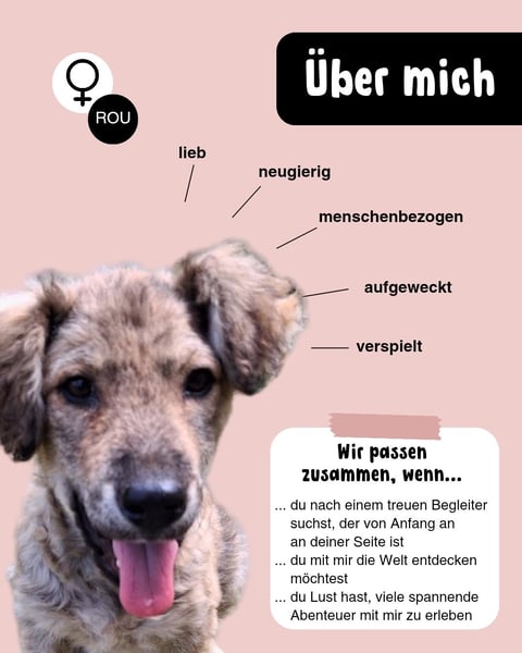 Ich bin neugierig, verspielt und freue mich über jeden Menschen, der mir Aufmerksamkeit schenkt. Man sagt, ich bin ein fröhliches, liebes Mädchen, das einfach nur ankommen möchte.