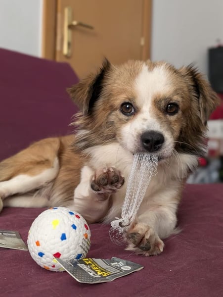 Biscuit liebt Ballspiele. Er wirft den Ball sogar selbst und jagt ihm hinterher (das Zurückbringen hat er noch nicht gelernt, aber er ist so schlau, dass er es sicher bald beherrschen wird). Zerstört hat der kleine Kerl noch nie etwas. Ich gebe ihm aber ab und zu Papier oder Kartons und er hilft dann beim Recycling, sprich Zerkleinern.