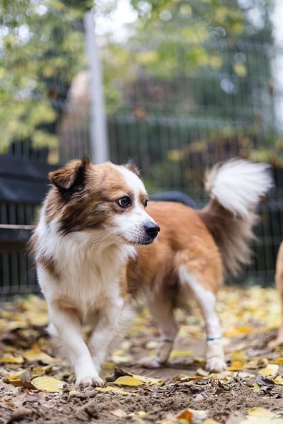 Er versteht sich mit den meisten Hunden gut und spielt besonders gern mit kleineren Hunden. Größere Hunde schüchtern ihn manchmal ein bisschen ein – wahrscheinlich