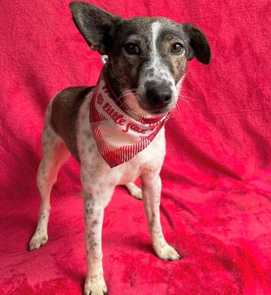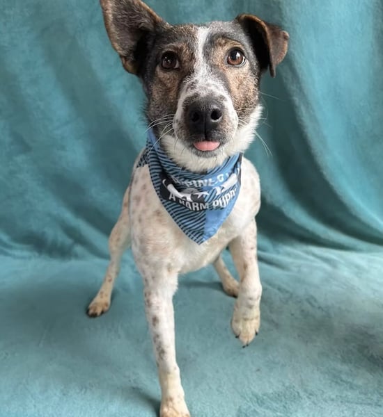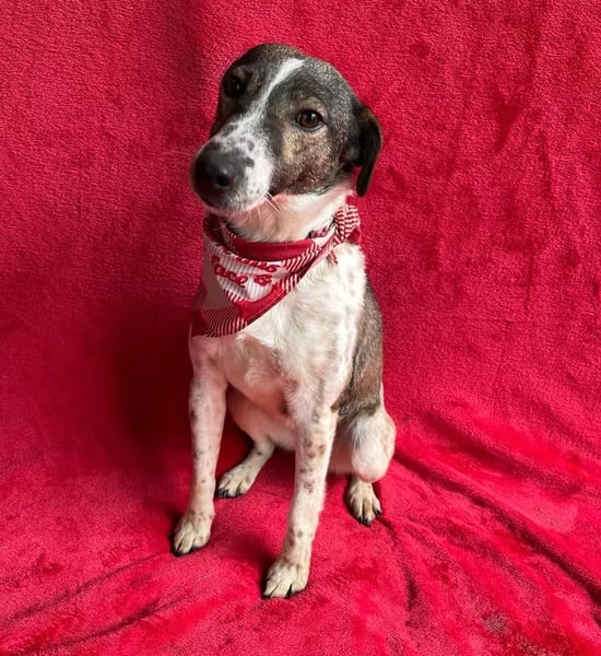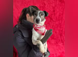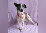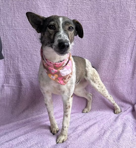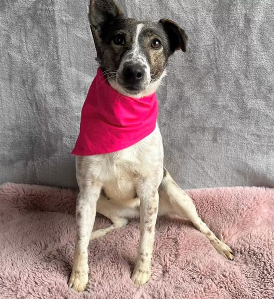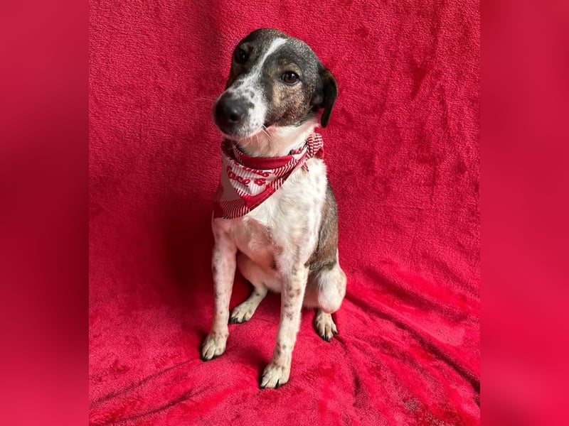 Vasilisa ist eine zarte Mischlingshündin mit weiß-braunem, kurzem Fell und einem liebevollen Blick. Geboren am 01.06.2020, misst sie etwa 38 cm und wiegt rund 7,3 kg.