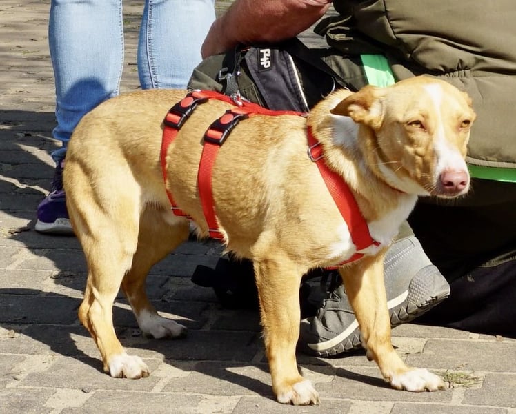 Draußen an der Leine läuft er relativ locker und lässt sich sehr gut halten. Er rennt nicht voraus und schaut nach den Bezugsmenschen.