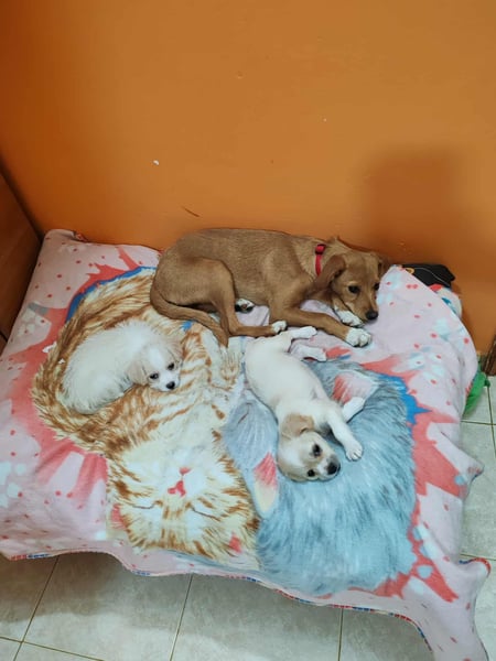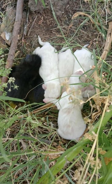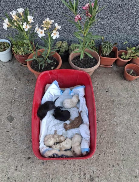 Eine Dame hat im Sommer in einer zugebundenen Tasche 5 Hundewelpen und 3 Katzenbabys gefunden. Sie alle waren erst wenige Tage alt und wurden auf dem Feld zum Sterben zurückgelassen.