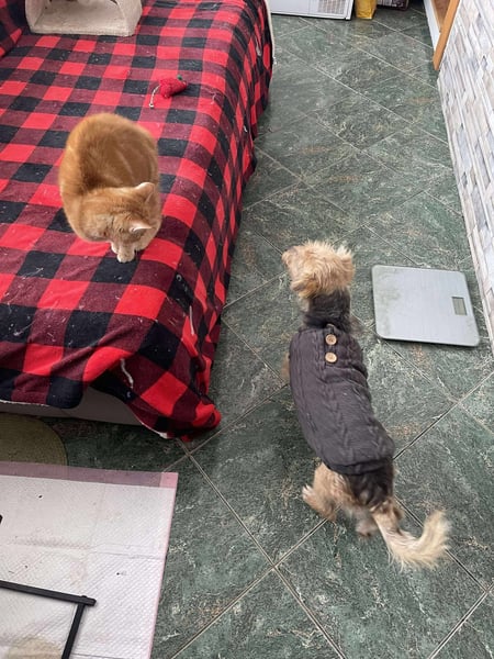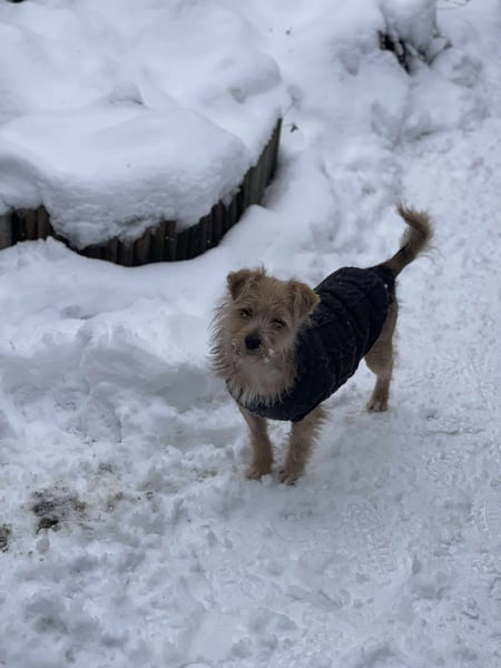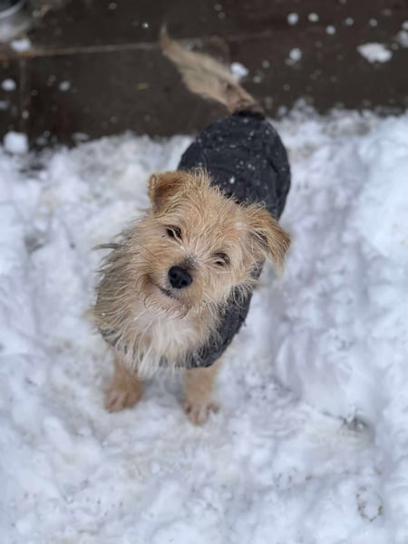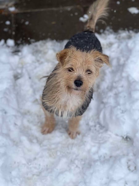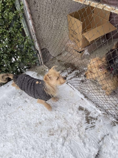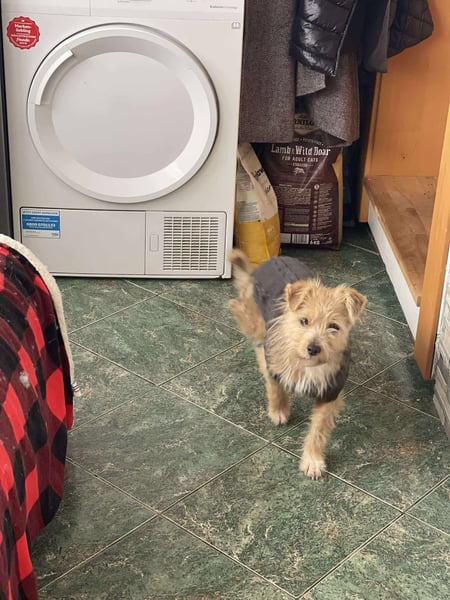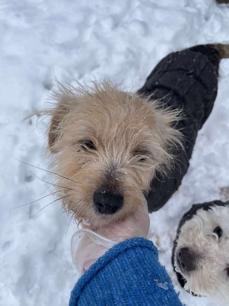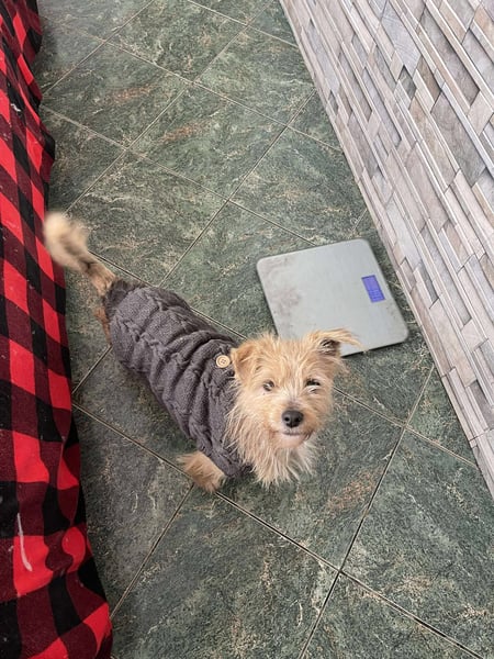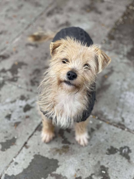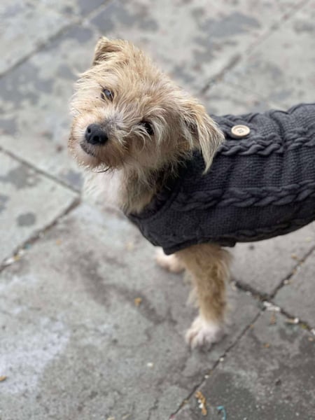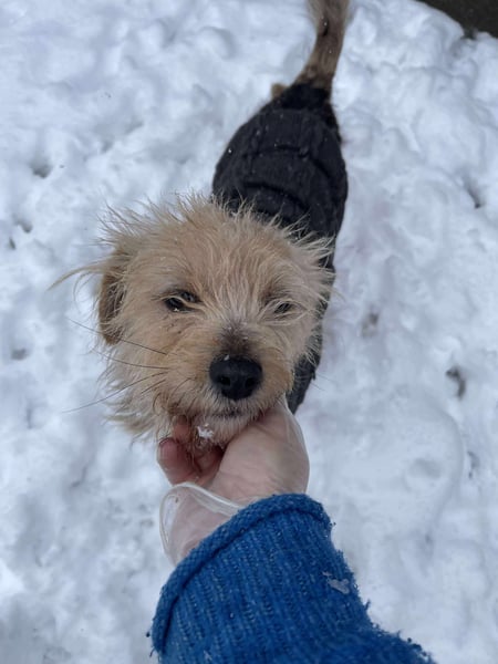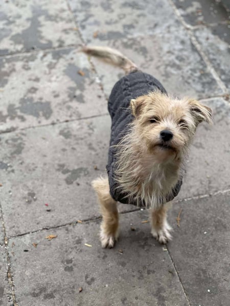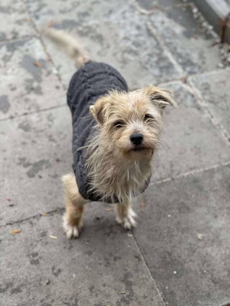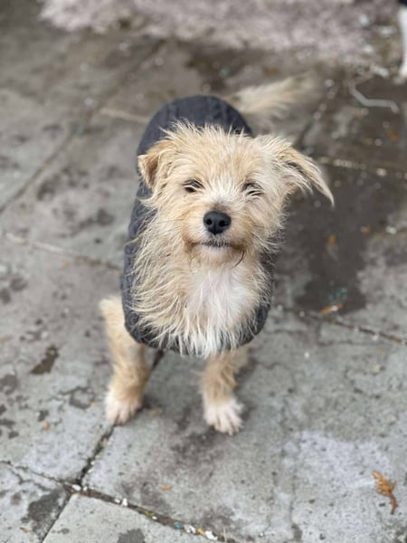 Pip wurde im November 2025 alleine am Straßenrand gefunden. Sie war sehr dünn, hatte Prellungen, Flöhe, eine Floh-Allergie und einen Bruch am Hinterbeinchen.