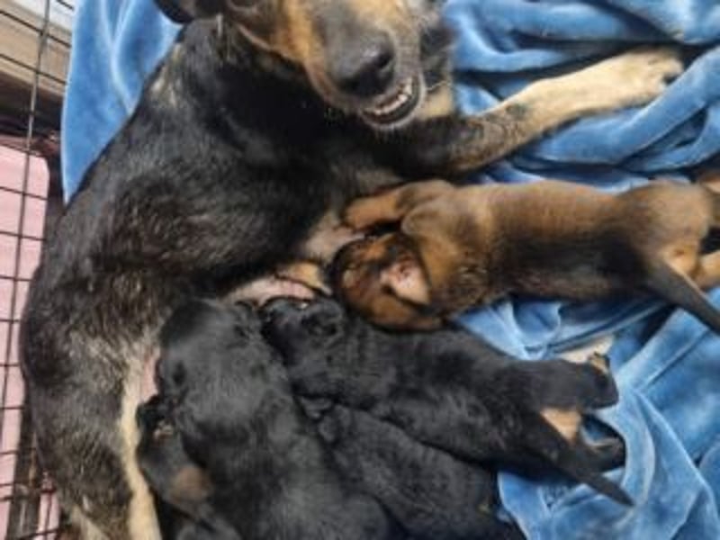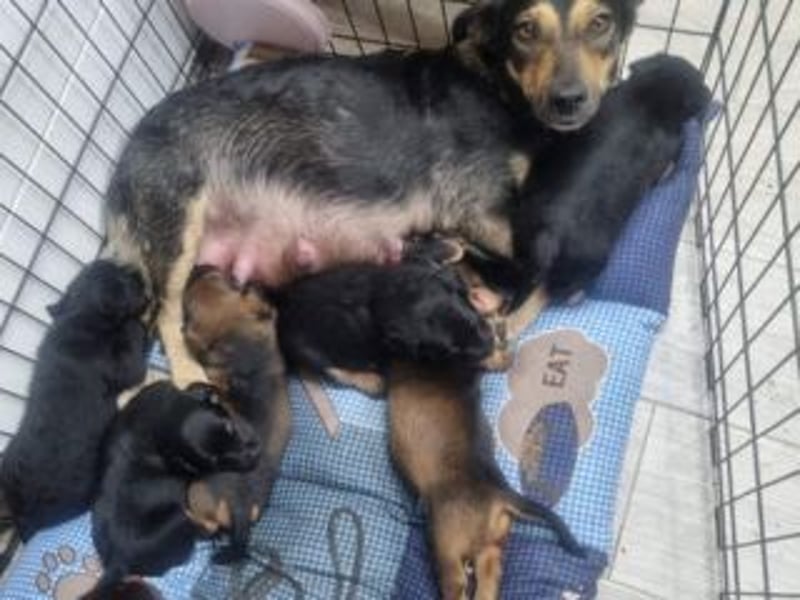 Fiama war auf einer Landstraße unterwegs, als sie auf eine Baustelle stieß. Dort halten sich viele Hunde auf, weil es dort viele Arbeiter gibt, die netterweise den Streunern regelmäßig etwas zu Fressen geben. Fiama hielt dort ebenfalls an und bettelte auch um Futter. Einem jungen Mann fiel die Hündin auf und er bemerkte, dass sie etwas rundlich war. Er informierte das Tierheim Mi Fiel Amigo, welches die Hündin natürlich aufnahm. Ein Check in der Tierklinik ergab, dass Fiama trächtig war und die Geburt in wenigen Tagen sein würde. Fiama durfte zunächst in der Tierklinik bleiben, wo sie nach wenigen Tagen in Sicherheit ihre Welpen auf die Welt brachte. Es waren neun Welpen, wovon aber nur sieben überlebten. Die Tierklinik stellten Fiama und ihren Welpen ihren Lagerraum für die ersten drei Wochen zur Verfügung, bevor die kleine Hundefamilie auf eine private Pflegestelle umziehen durfte.