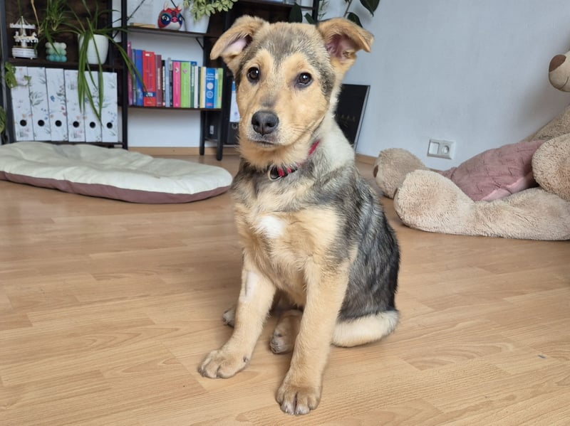 Sie lernt mit einer erstaunlichen Geschwindigkeit und einer Begeisterung, die einem das Herz schmelzen lässt. Schon am ersten Tag auf ihrer Pflegestelle lief sie mutig die Treppe hinauf, am zweiten Tag die Treppe wieder hinunter, als würde sie zeigen wollen: „Ich will so gerne verstehen, wie diese Welt funktioniert – zeig sie mir.“ Auch das Thema Stubenreinheit meistert sie für ihr Alter großartig. Nachts schläft sie friedlich durch, und auch tagsüber gelingt es immer besser, sodass kleine Missgeschicke nur noch selten passieren. Sie liebt es, zu spielen – besonders mit dem Ersthund der Pflegestelle, der ihr Halt und Orientierung gibt. Und wie jeder Welpe braucht sie Kauspielzeug, um ihrer wachsenden Welt mit ihren kleinen Zähnchen gerecht zu werden.