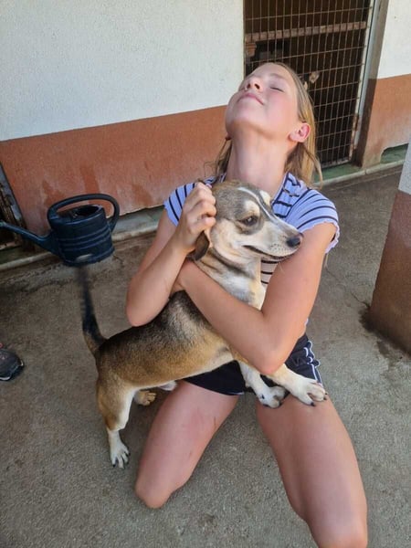 Dion hat sich super entwickelt! Er ist ein neugieriger, unkomplizierter Junghund geworden, der Streicheleinheiten jetzt sichtlich genießt. Auch ihm fremde Personen waren für ihn beim Besuch meiner Kollegen in Ungarn kein Problem. Auch Männer findet er klasse, wenn sie Leckerchen dabei haben. Emma, den Teenie, fand er aber am Besten (siehe Fotos) :-D