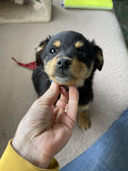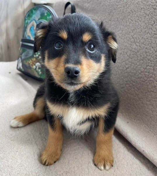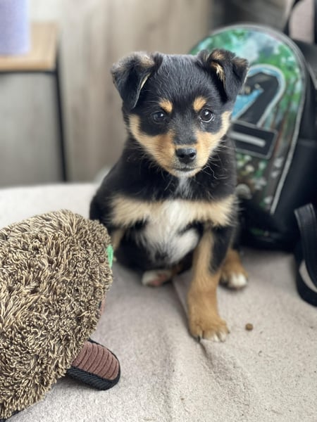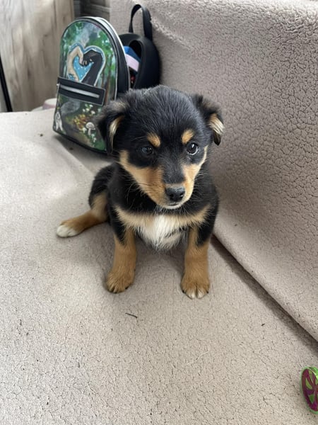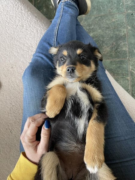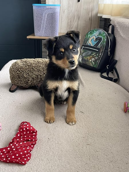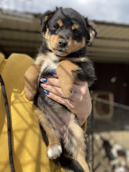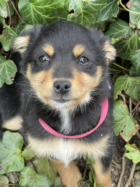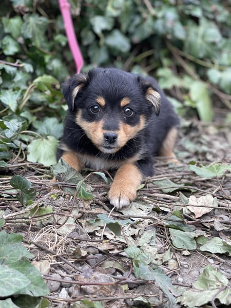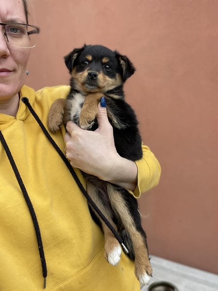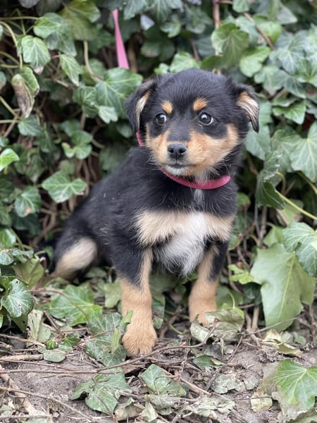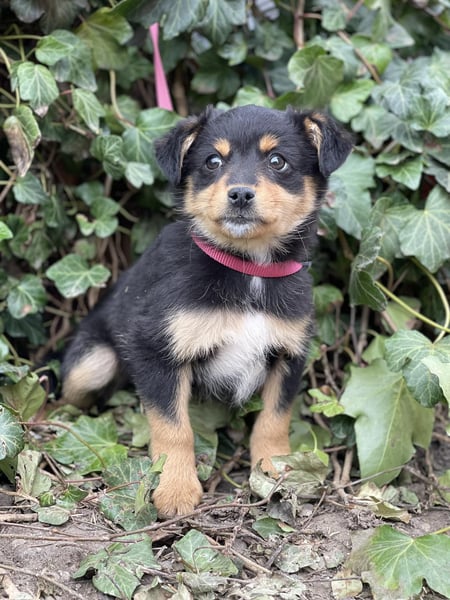 Polly's Mama Pixie hatte wahrscheinlich nie einen Besitzer. Im Januar 2026 erschien sie plötzlich an einem verlassenen Hof, sie war hochschwanger. Einige Tage später brachte sie dort sechs Welpen zur Welt und versteckte sie unter einem Stapel Brennholz.