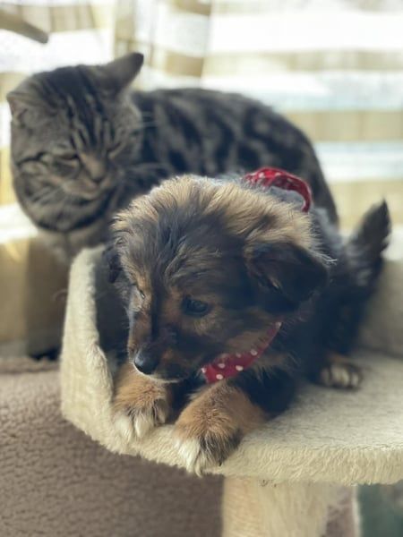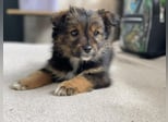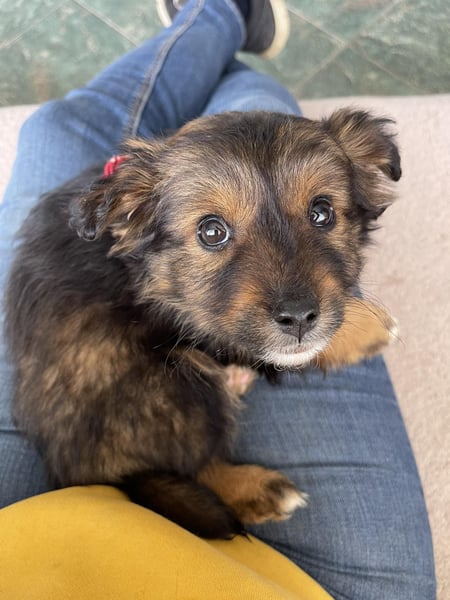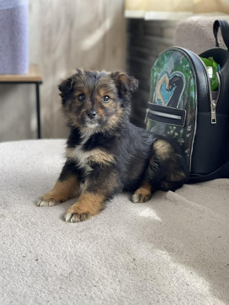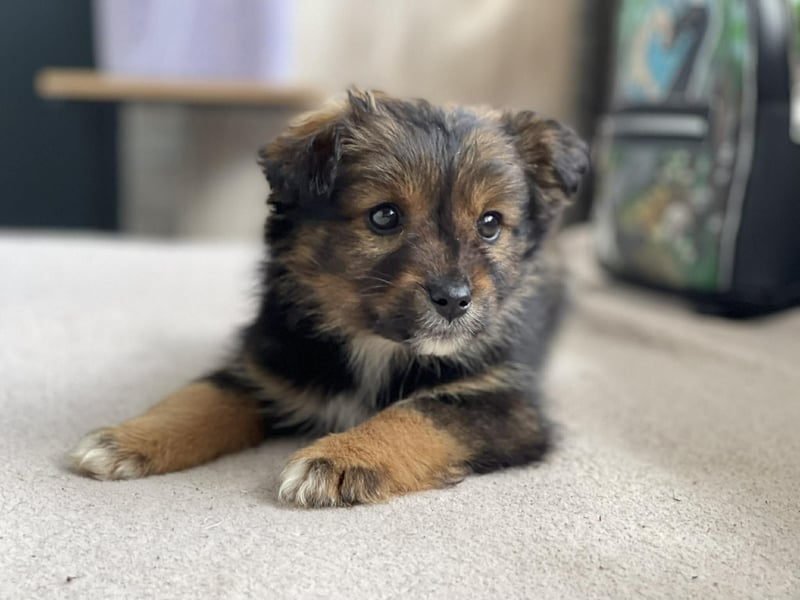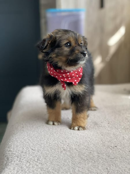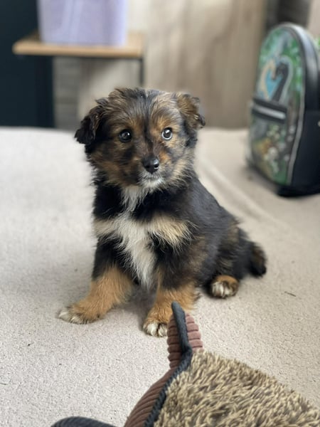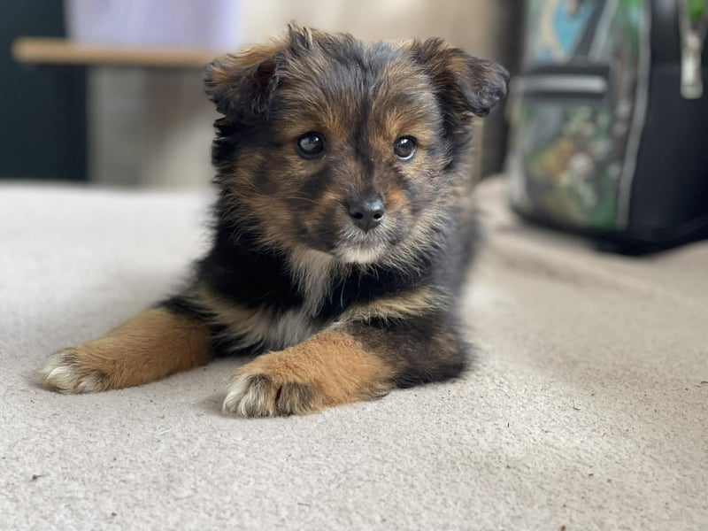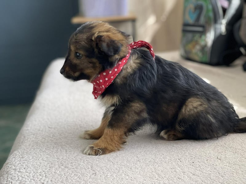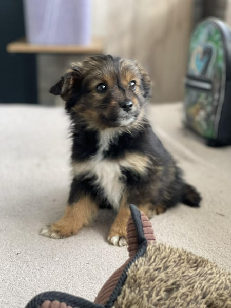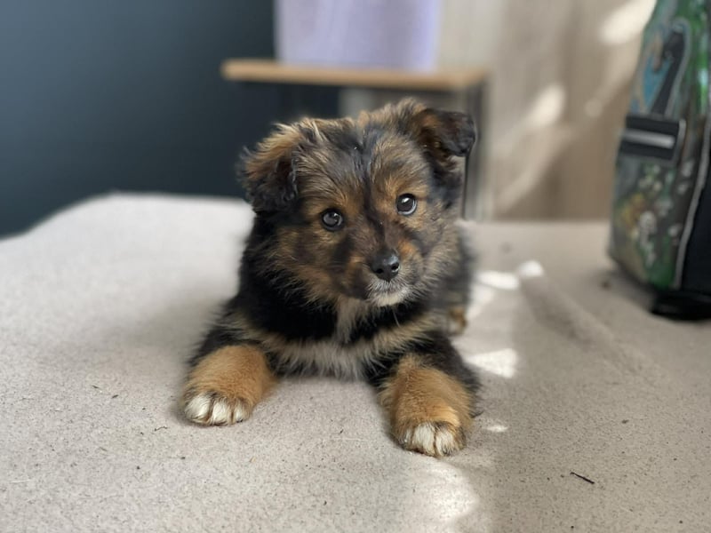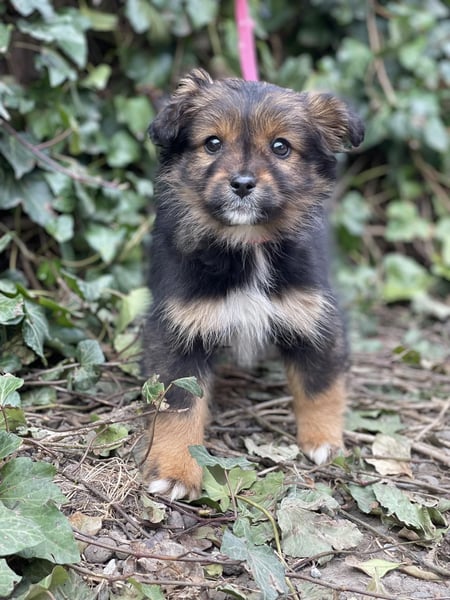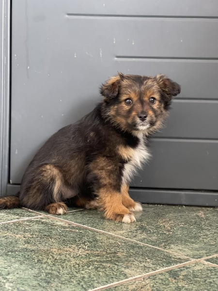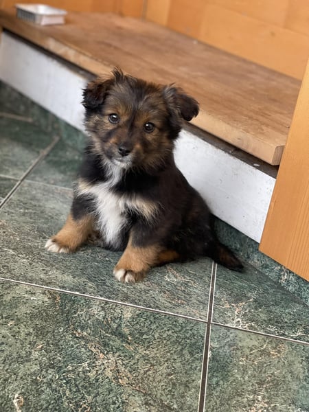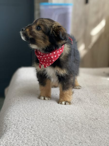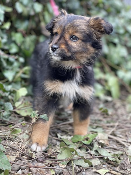 Penny's Mama Pixie hatte wahrscheinlich nie einen Besitzer. Im Januar 2026 erschien sie plötzlich an einem verlassenen Hof, sie war hochschwanger. Einige Tage später brachte sie dort sechs Welpen zur Welt und versteckte sie unter einem Stapel Brennholz.