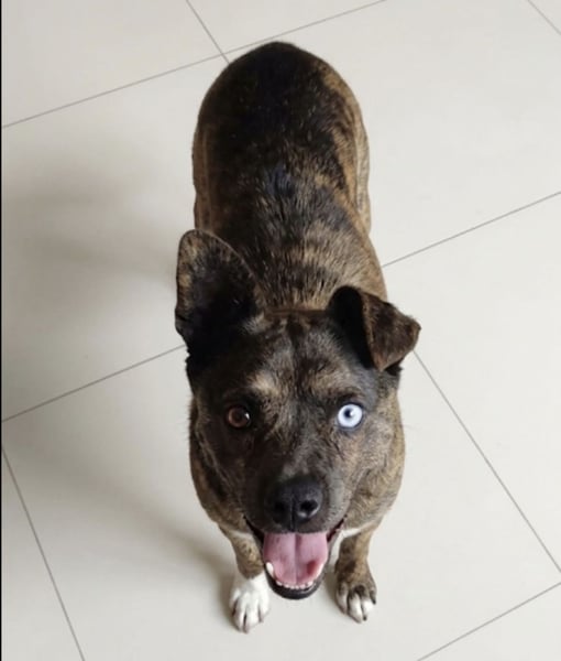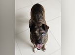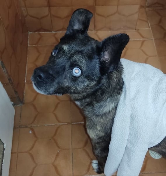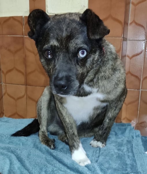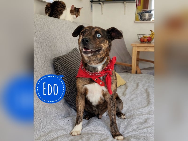 Edo ist ein Rüde, laut Tierarztschätzung ca. 7 Jahre alt (geb. 15.06.2019), 41 cm groß und wiegt etwa 12 kg. Vermutet wird ein aussergewöhnlicher kleiner Querbeet Mischling. Besonders auffällig sind seine Augen – eines ist komplett blau, das andere nur ein blauer Punkt.