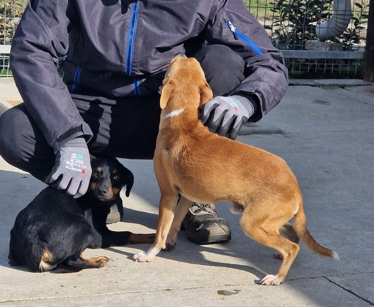 Zu Beginn zeigten sie sich ängstlich und unsicher. Die neue Umgebung im Tierheim und die ungewohnte Umgebung, aber wohl auch das eingesperrt Sein konnten sie zunächst nicht wirklich verstehen. Mittlerweile haben sie sich jedoch gut eingelebt. Sie sind ruhiger geworden und zeigen sich als freundliche und menschenbezogene Hunde. Beide lassen sich gerne streicheln und suchen den Kontakt zu uns Menschen. Mit anderen Hunden zeigen sie sich freundlich; durch das Gitter gab es bisher keinerlei Probleme.