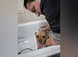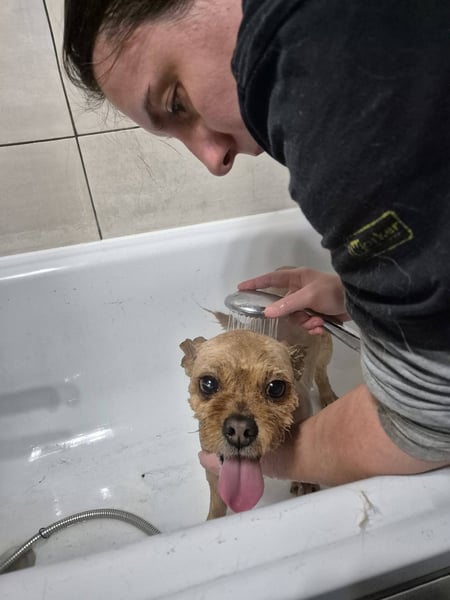 dieser ältere, unkastrierte, Rüde wurde von einer Rumänin gebracht, deren Mann verstorben ist und sie selbst jetzt nach Deutschland zieht, wo ihre Tochter lebt. Den Hund wollte sie aber nicht mitnehmen. Also wurde er kurzerhand in einen blauen Müllsack gesteckt, verschnürt, in den Kofferraum gelegt und zur Farm gebracht. Die Menschen sind einfach grausam..... Auf der Farm wurde er erstmal von Eugenia versorgt, ein schönes warmes Bad hat das alte Leben abgewaschen und jetzt kann er ein neues Leben beginnen.