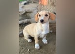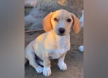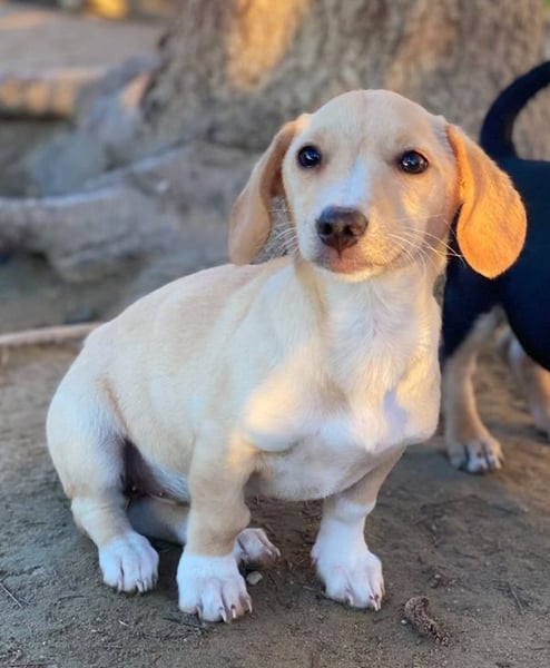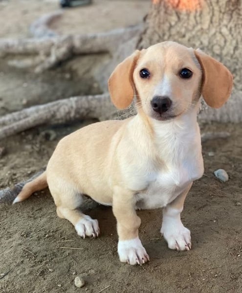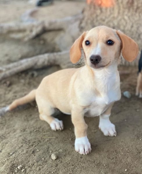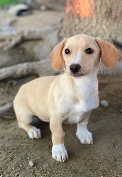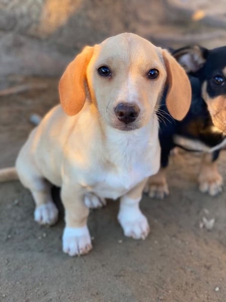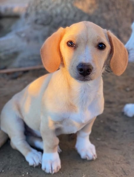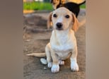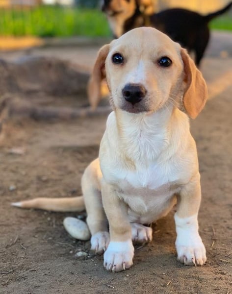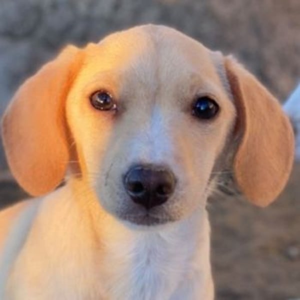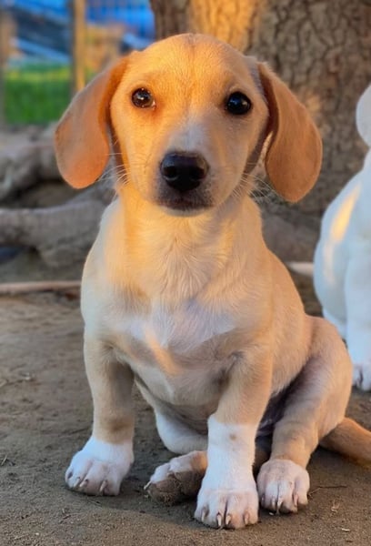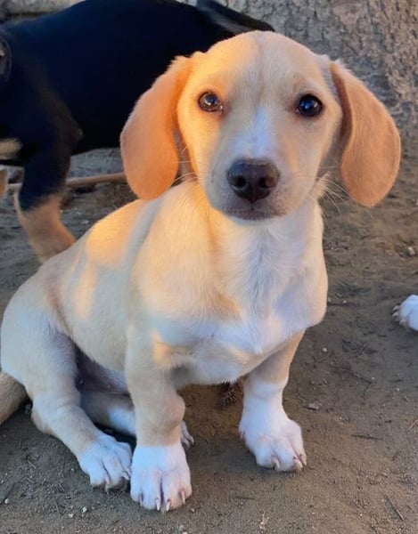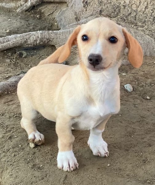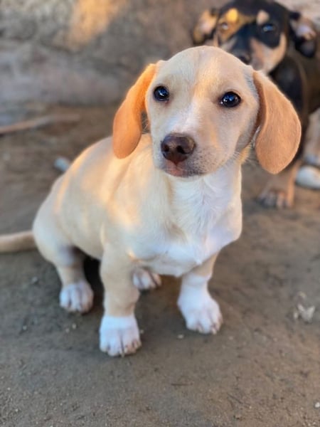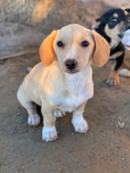Rigatoni ist eine zuckersüße, beigefarbene Hündin mit einigen weißen Abzeichen an der Brust und den Beinen. Die kleine Maus hat nicht nur große Schlappohren, sondern auch verhältnismäßig große Pfötchen und das, obwohl sie später vermutlich nicht groß werden wird.