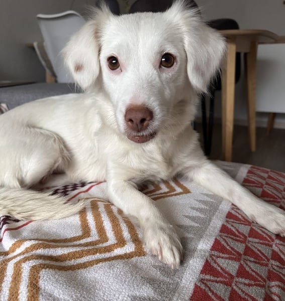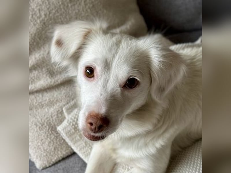 Holiday ist eine kleine Hündin mit schönem, weißem, sehr weichem Fell und einer sanften Ausstrahlung.