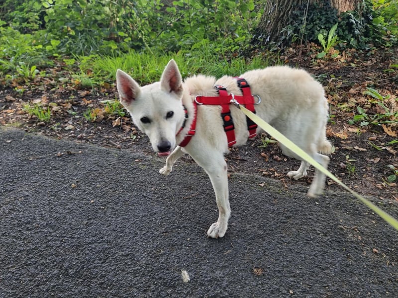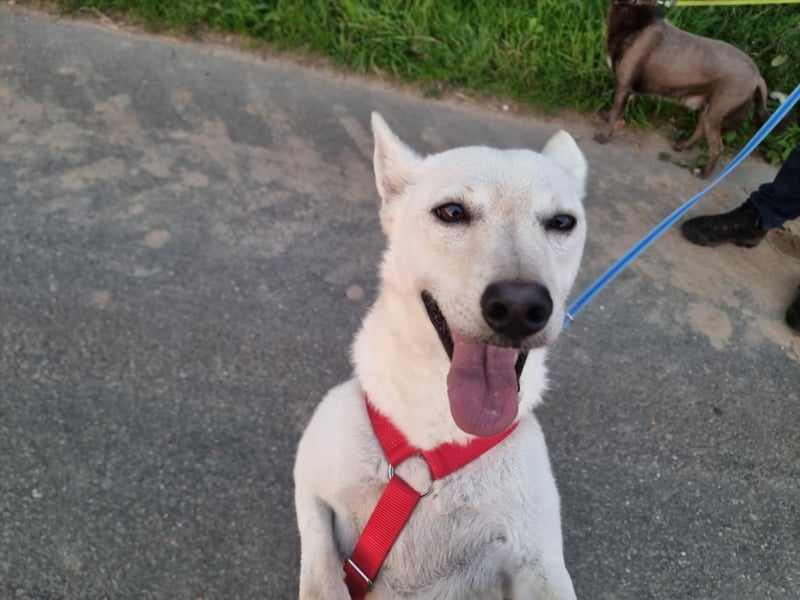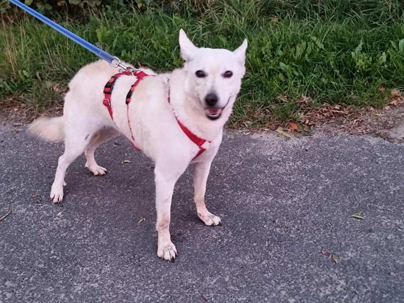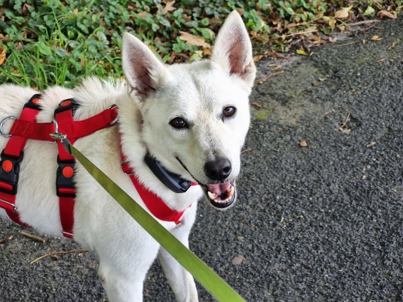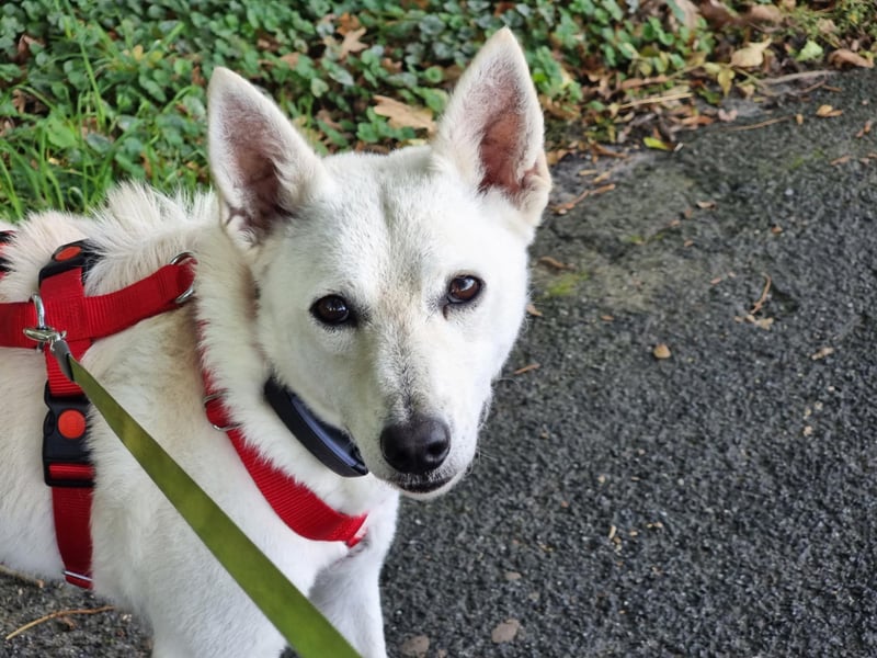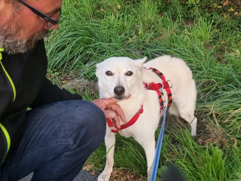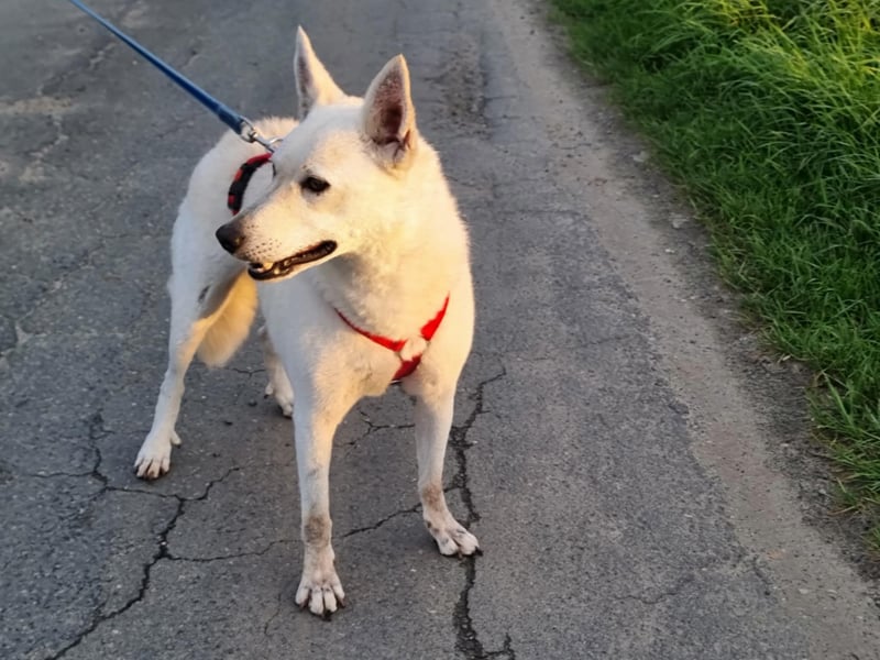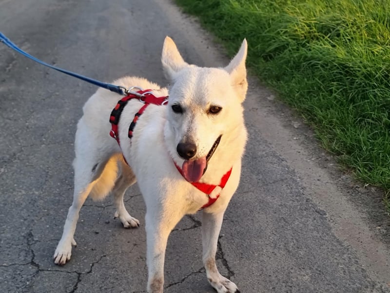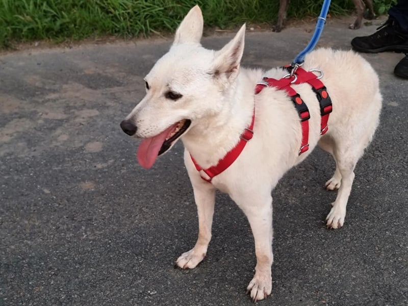 Kokusz ist eine sensible Hündin, die ihre Umgebung aufmerksam beobachtet und dabei interessiert am Familienleben teilnimmt. Sie läuft bereits super an der Leine, genießt Spaziergänge und hat sogar Freude daran, am Scooter oder Fahrrad mitzulaufen. Auch das Autofahren klappt problemlos. In manchen Momenten ist sie noch etwas schreckhaft, was nach ihrer langen Zeit im Tierheim verständlich ist, doch sie taut jeden Tag ein Stückchen mehr auf und gewinnt sichtbar an Selbstvertrauen.