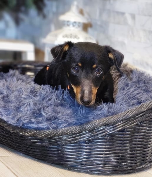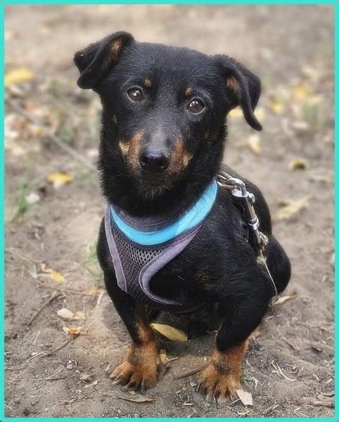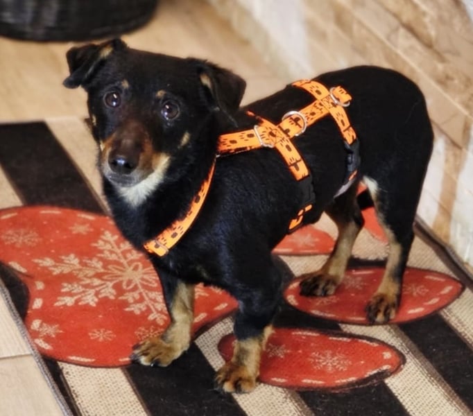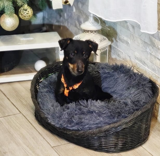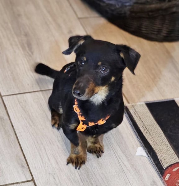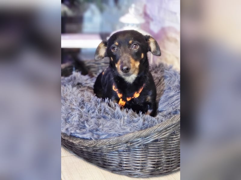 Pimpf, Rüde, Pinscher Mischling, geboren ca. 01. August 2022, kastriert, Schulterhöhe: ca. 27 cm und ca. z.Z. 2,8 Kilo, Vermittlung zu Katzen: ja, wenn diese das Leben mit Hunden kennen.