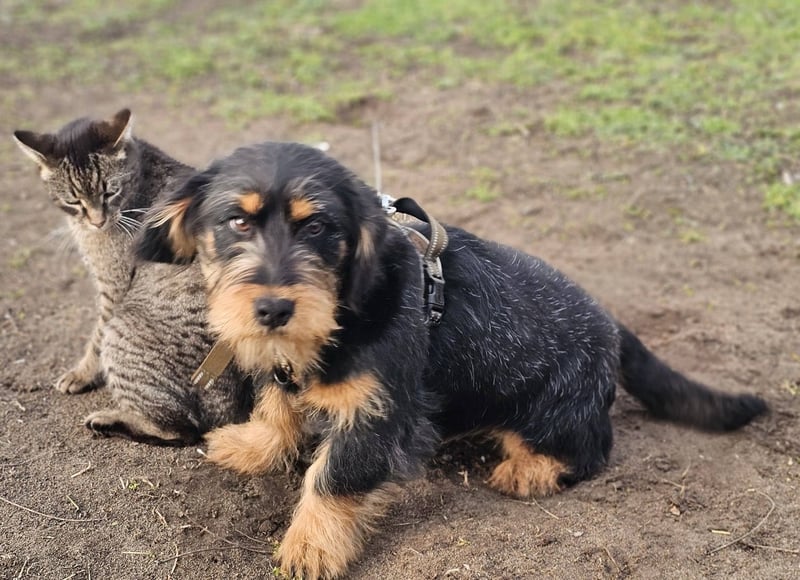 Im Rudel hat er schnell Freunde gefunden und zeigt sich sozial und zeigt keine Aggression und die Katzen draußen akzeptiert er.