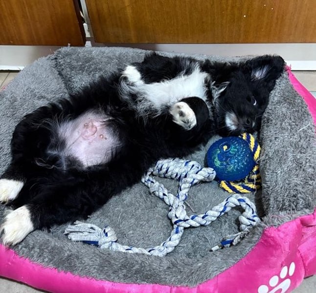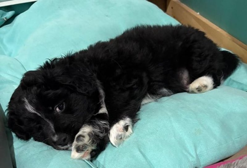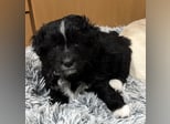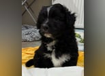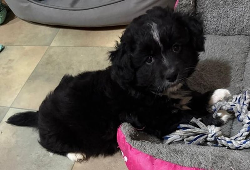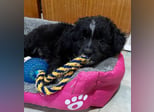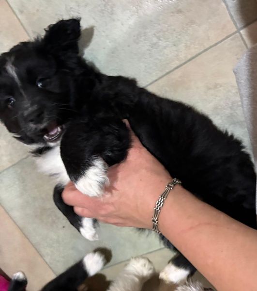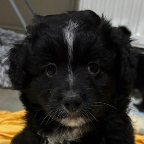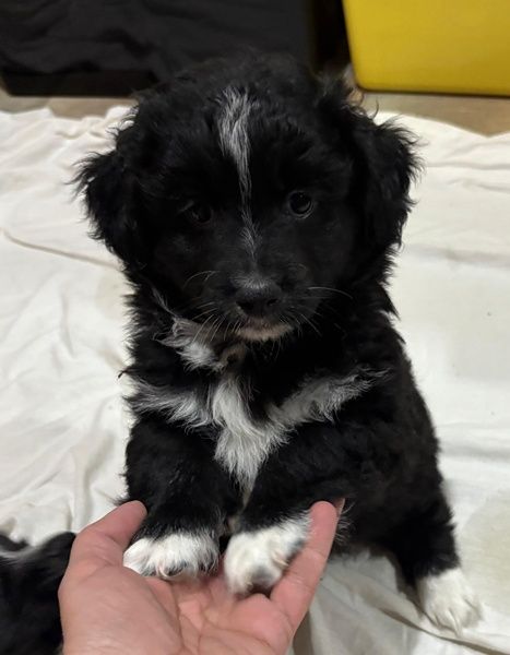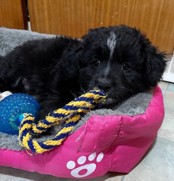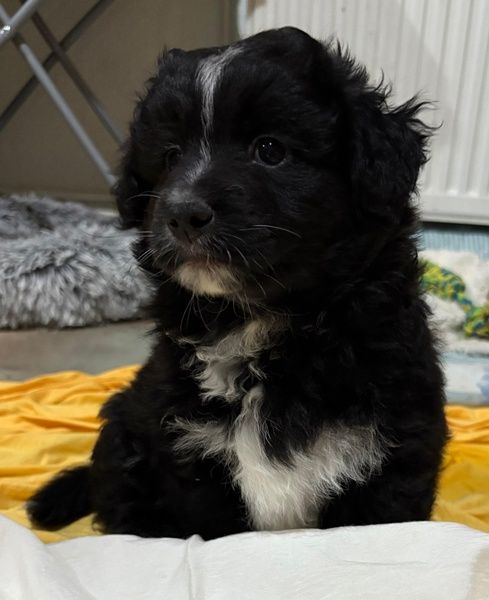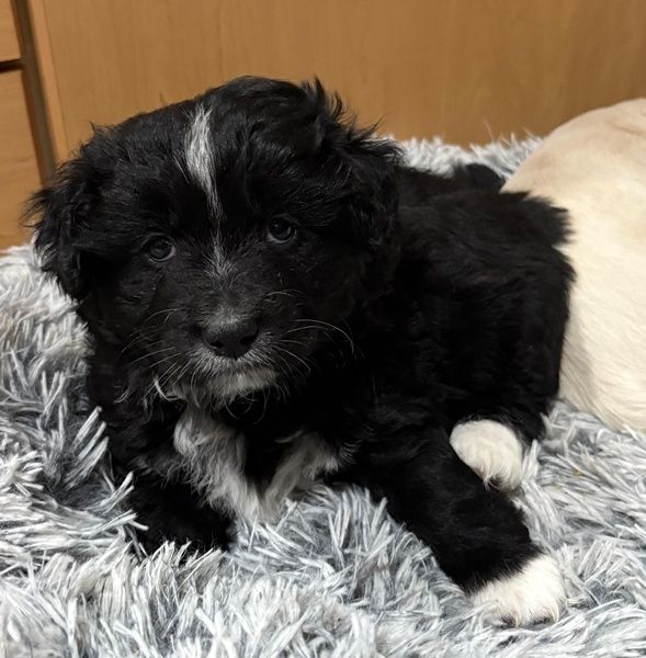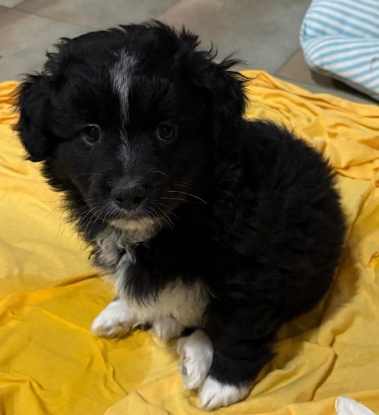 Mr. Rod ist ein junger Rüde mit schwarzem, leicht lockigem Fell, das von feinen weißen Zeichnungen hübsch akzentuiert wird. Sein wuscheliges Aussehen verleiht ihm einen ganz besonderen Charme, und sein Blick verrät sofort, wie sanft und aufgeschlossen er ist. Er wird voraussichtlich eher klein bleiben und eignet sich damit wunderbar als treuer Begleiter für den Alltag.