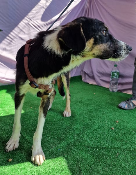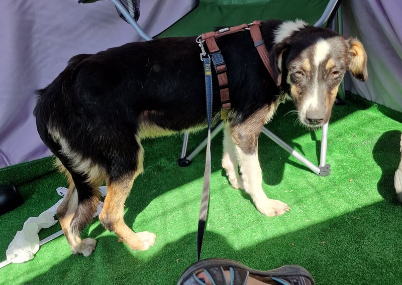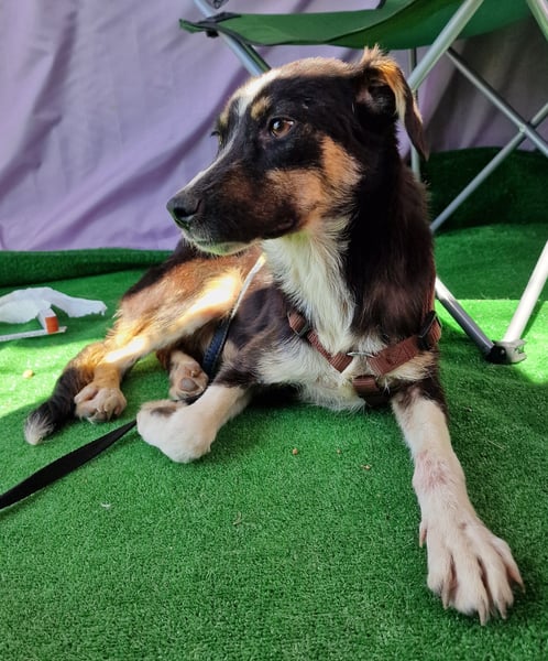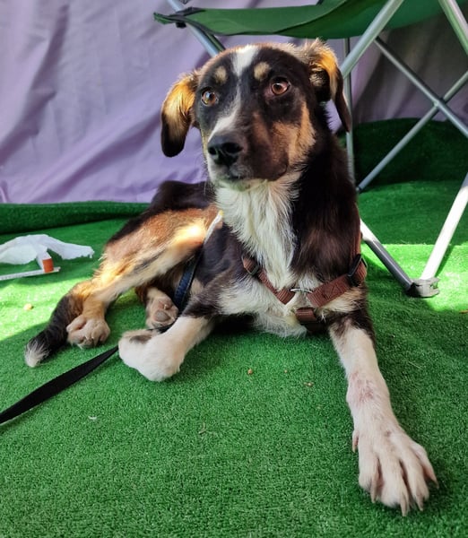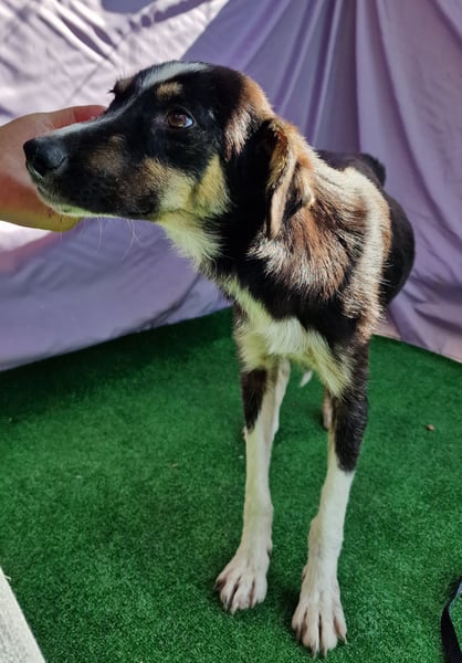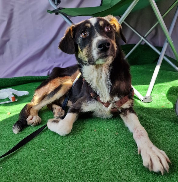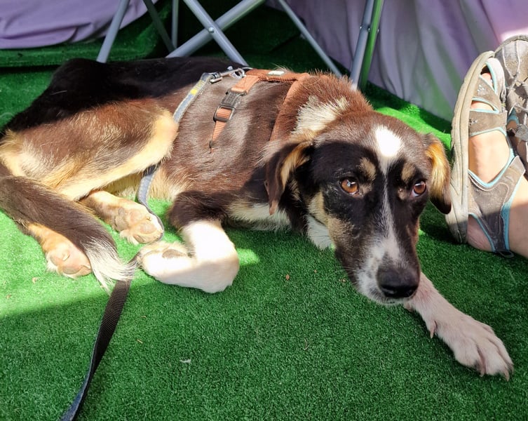 Zora, Mischlings-Mädchen, geboren am 28.08.2023, hat derzeit eine Schulterhöhe von ca. 45-50 cm und wiegt etwa 15 kg.
