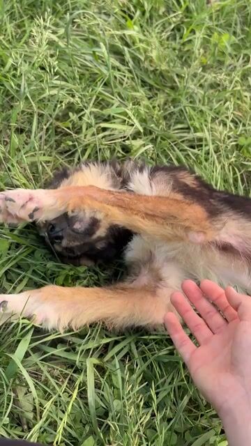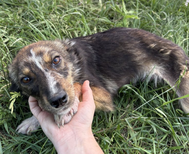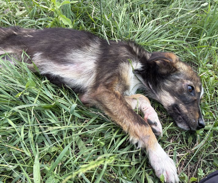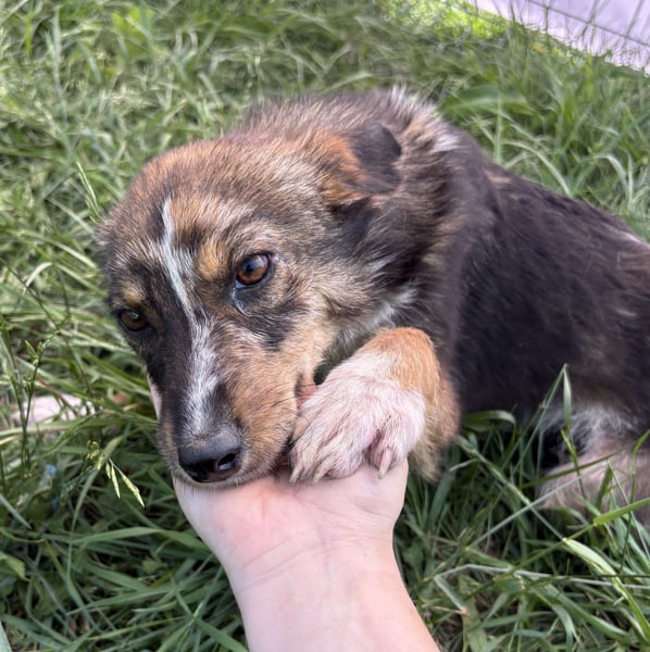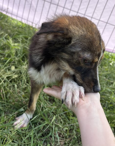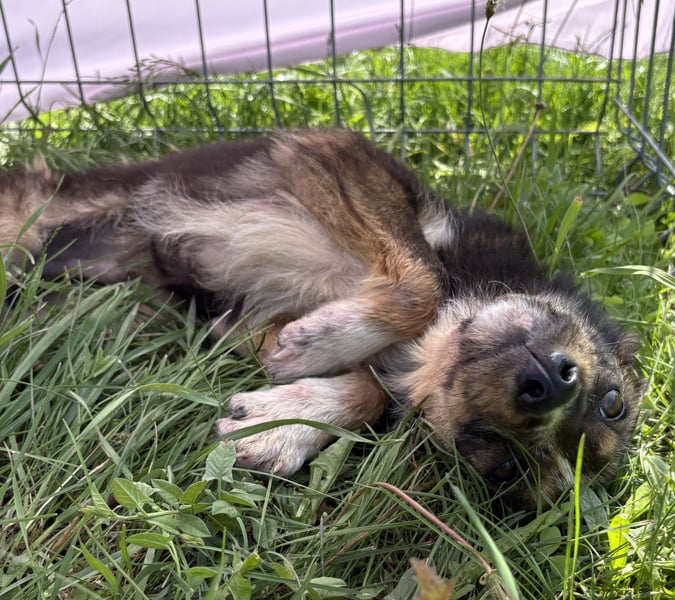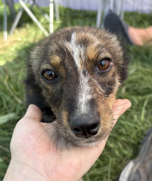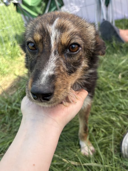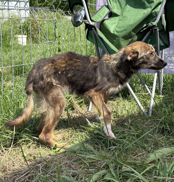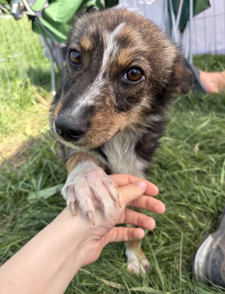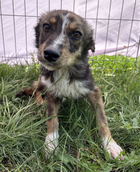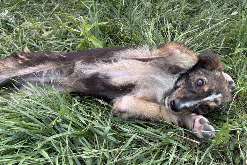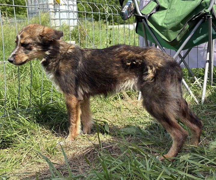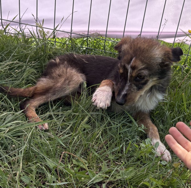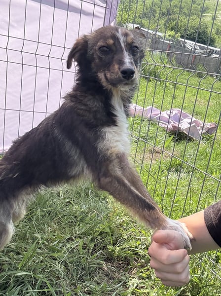 Theo, Mischlingsjunge, geboren am 01.02.2025, hat eine Schulterhöhe von ca. 30-35 cm und wiegt etwa 7 kg.