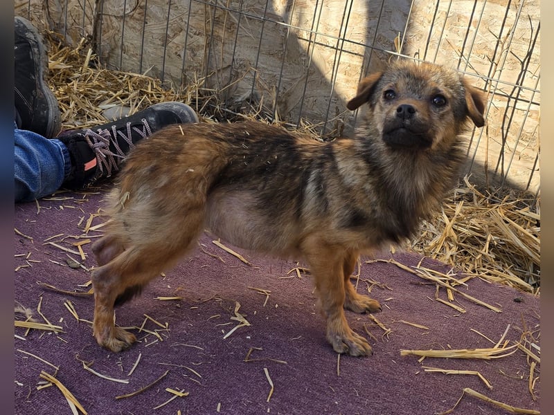 Anne, Mischlings-Mädchen, geboren am 10.12.2024, hat derzeit eine Schulterhöhe von ca. 30-35 cm und wiegt momentan etwa 8 kg.