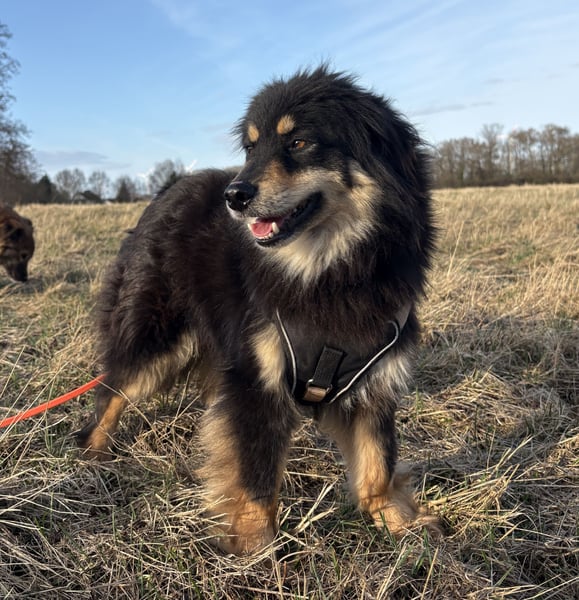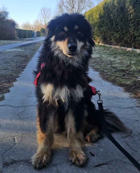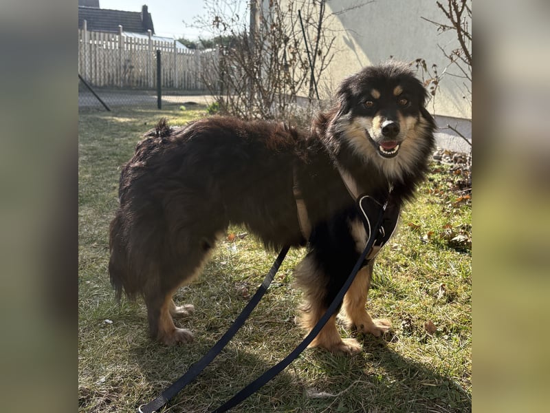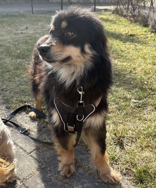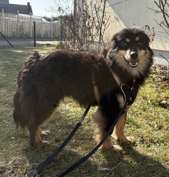 Lio, Mischlingsjunge, geboren am 08.03.2023, hat eine Schulterhöhe von ca. 40 cm und wiegt etwa 10 kg.