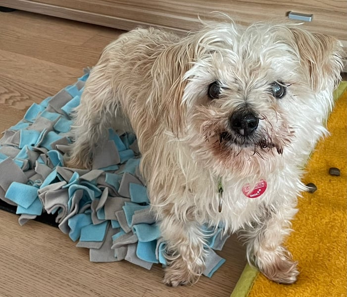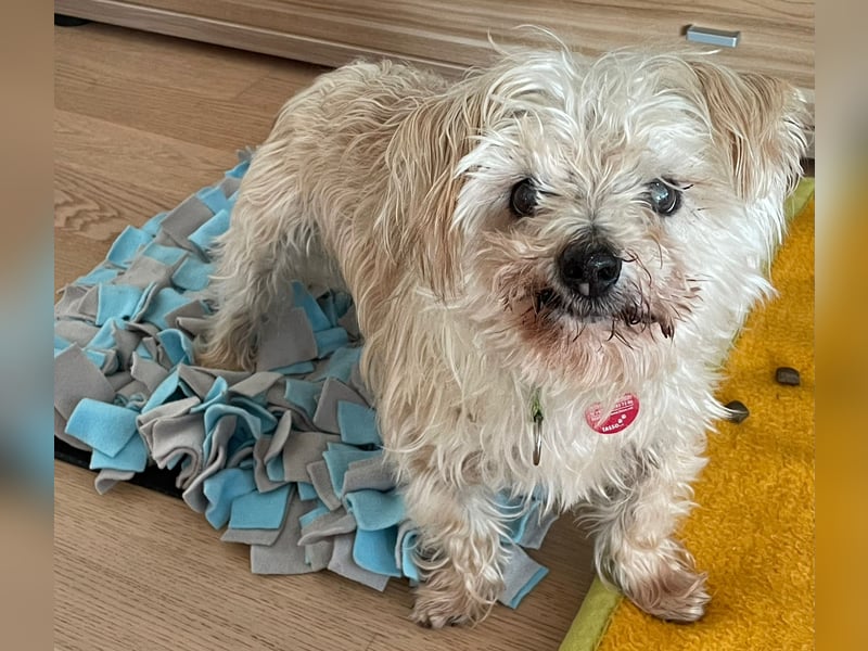 Er ist ein eigenständiges Kerlchen, er mag fressen, schlafen, Gassi, wie es dem Alter entspricht. Sehr gerne ist er überall dabei. Hören und Sehen funktioniert sehr eingeschränkt, aber er kommt gut damit zurecht! Am Kopf anfassen ist ok, am Körper muss es nicht sein. Daher mag er auch nicht gebürstet werden und beim Tierarzt trägt er einen Maulkorb.