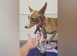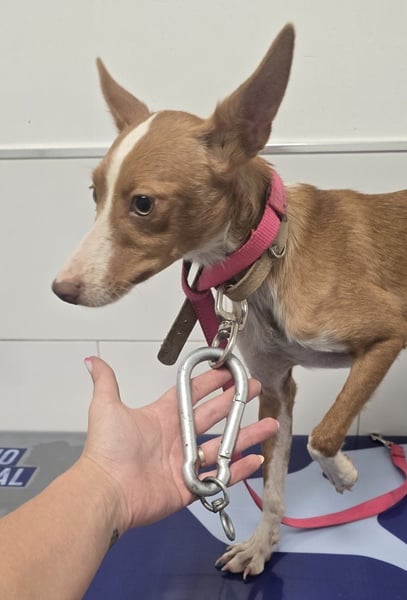 Als sie ihm die Leine umlegten, stießen sie auf eine böse Überraschung: Lolo trug ein Halsband. Und daran hing ein riesiger, schwerer Karabiner. Der junge Rüde muss sich irgendwie losgerissen haben und geflohen sein.
