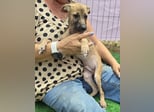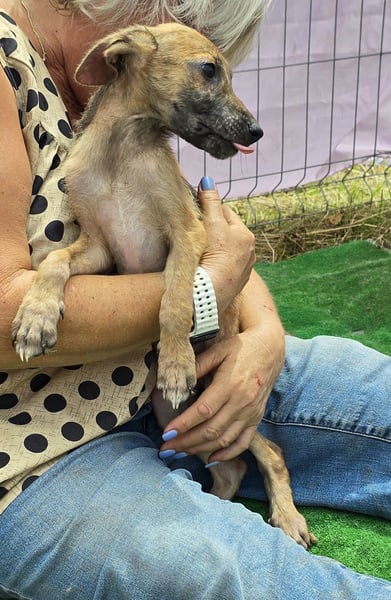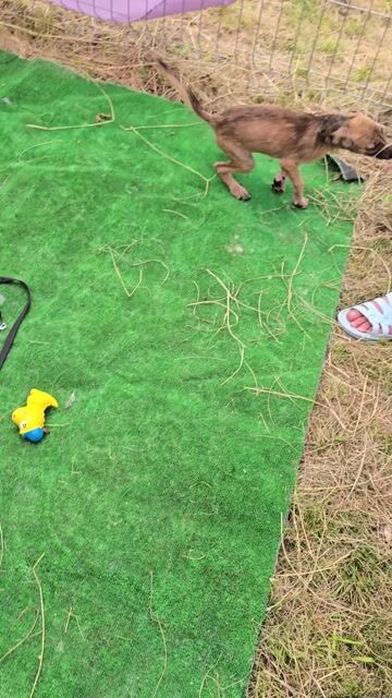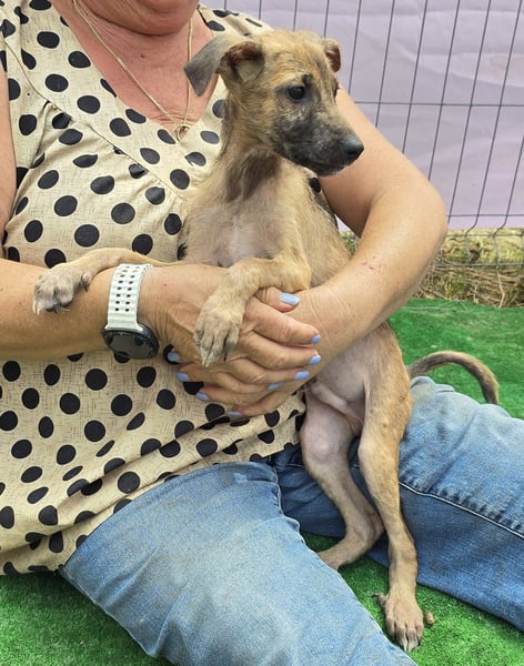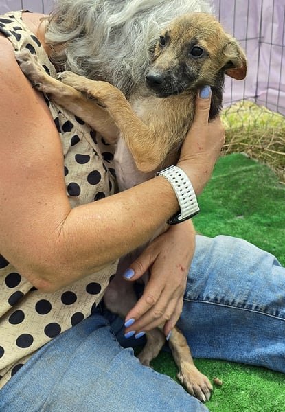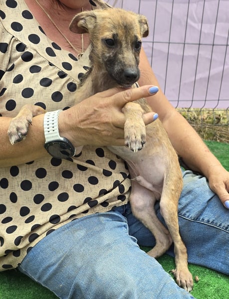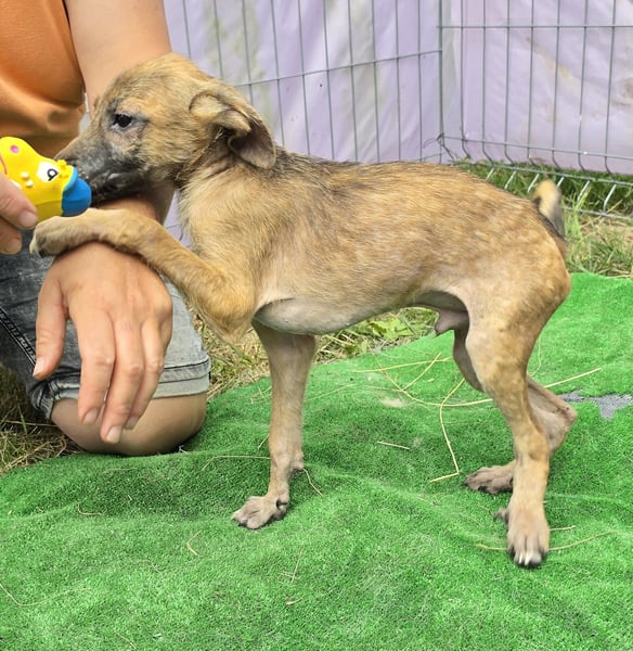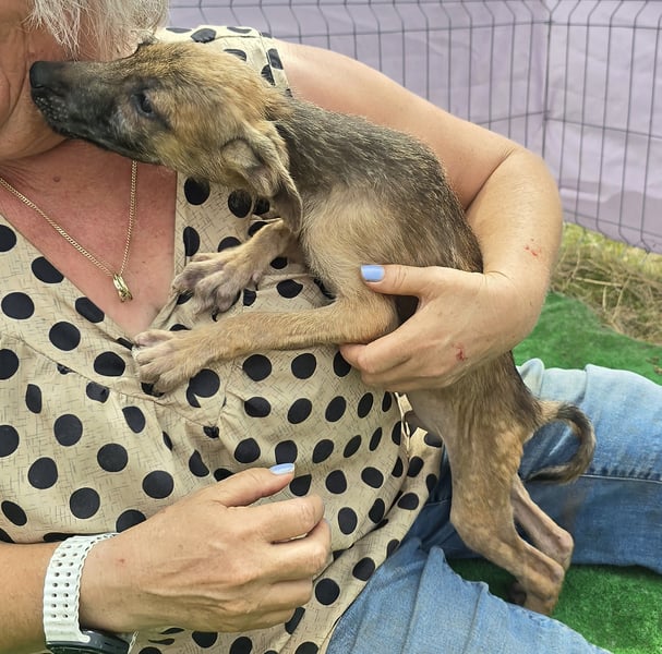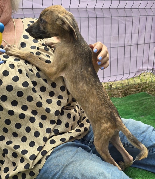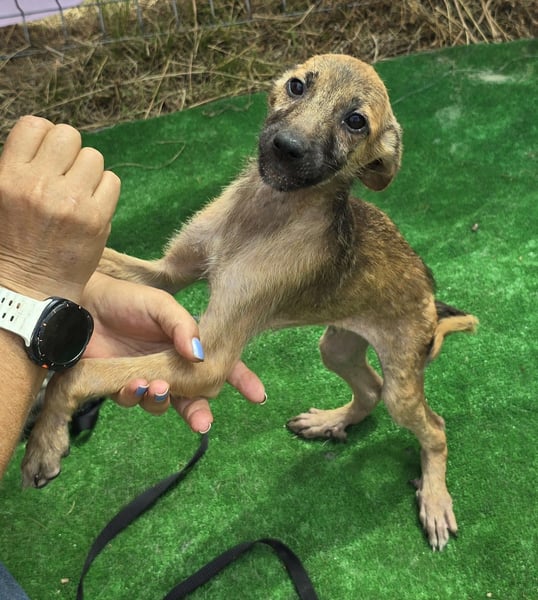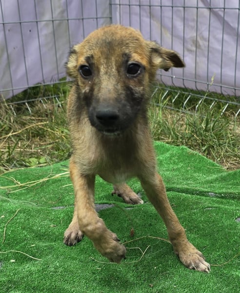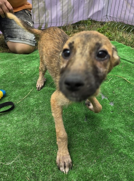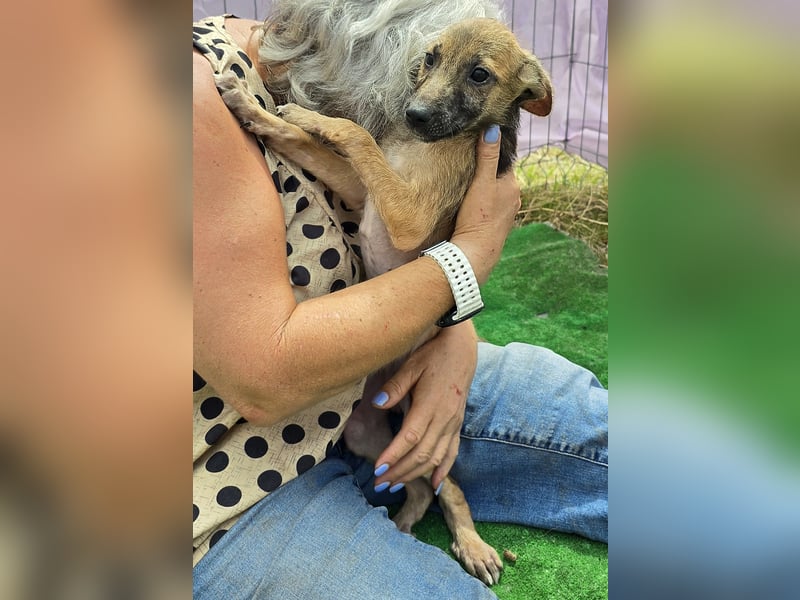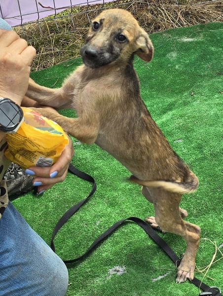 Pumba, Mischlingsjunge, geboren am 20.05.2025, hat derzeit eine Schulterhöhe von ca. 25 cm und wiegt ca. 4kg. Wir schätzen, dass er maximal mittelgroß werden wird.