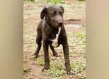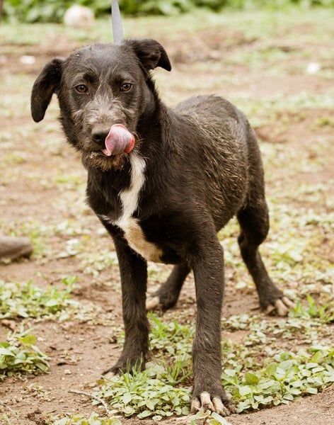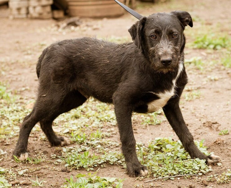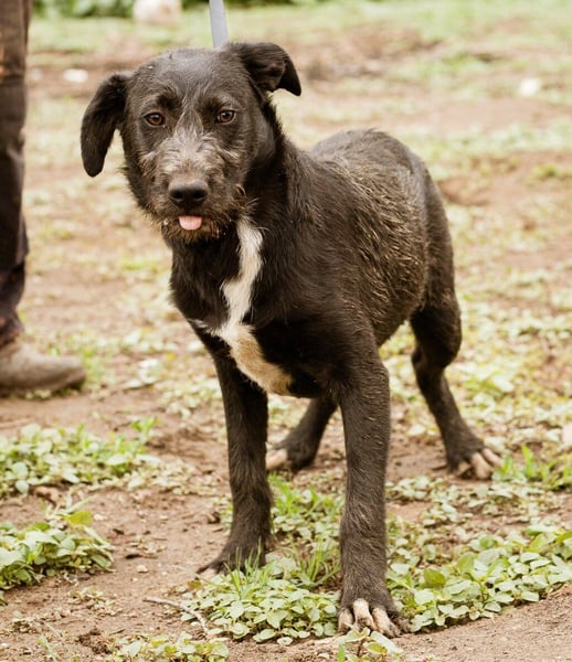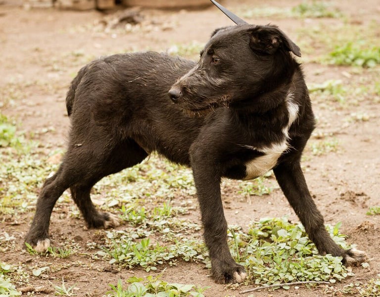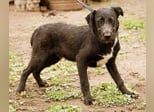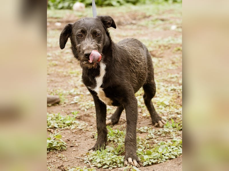 Mit meinem schwarzen, leicht strubbeligem Fell und den weißen Abzeichen auf der Brust und an den Pfoten, bin ich sehr hübsch anzusehen, aber an meiner Körperhaltung und in meinen schönen braunen Augen könnt Ihr erkennen, dass mir die Welt doch noch sehr unheimlich erscheint...