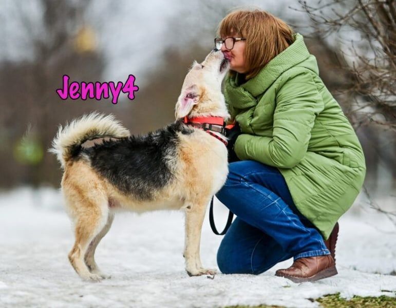 2018 wurde Jenny in einer russischen Stadt, auf einer eisigen Straße im Wald weit weg von den Wohnhäusern gefunden, wo die Temperaturen bis auf minus 50 Grad fallen können. Jenny hatte viele Wunden auf ihrem Rücken und ein schwer verletztes Hinterbein. Die Menschen retteten die Hündin und brachten sie in eine Tierklinik, wo sie behandelt und später auf einer Pflegestelle rehabilitiert wurde. Die Wunden auf ihren Rücken waren großflächig und brauchten lange Zeit, um zu heilen. Jennys Bein wurde operiert, ihr wurde eine Platte in die Pfote eingesetzt, mit der sie für immer leben sollte. Leider brach die Platte und Jenny musste erneut operiert werden, um eine neue Platte einsetzen zu lassen. Die neue Platte saß gut und wir freuten uns sehr für Jenny, bis die Platte nach einer Weile begann, die Haut zu durchzubrechen. In einer plastischen Operation wurde Haut an die Rissstelle verpflanzt. Die tapfere Jenny ertrug alle Behandlungen und Arztbesuche mit Heldenmut, Dankbarkeit und Geduld.
