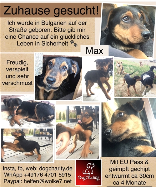 Max wurde auf den Straßen Bulgariens geboren und sucht nun sein zu Hause in dem er viel kuscheln, spielen und lernen kann. Er ist welpentyisch verspielt, neugierig und verschmust.