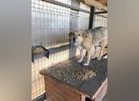 Wie ein Häufchen Elend steht Merlyn auf der Hütte im Käfig.