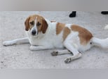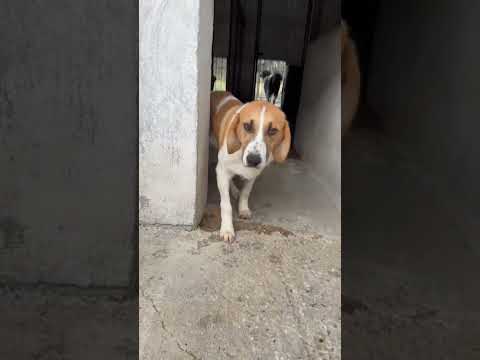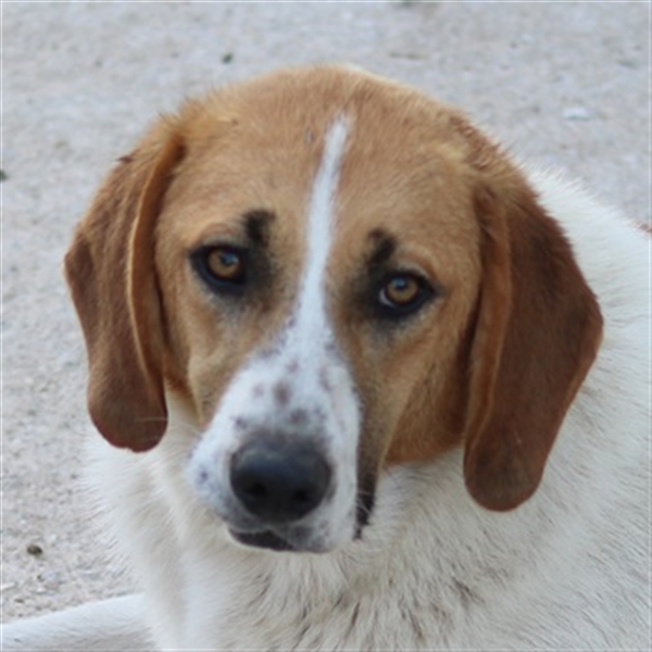 Tonio ist wirklich ein Goldschatz. Äußerlich besticht er mit großen Schlappohren und süßen Punkten auf der Schnauze. Seine braunen Augen sind dunkel umrahmt und schauen ganz treu in die Kamera.