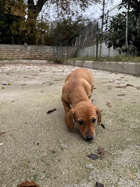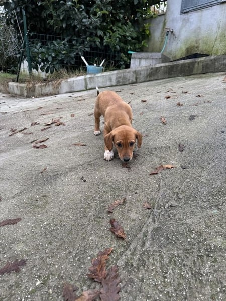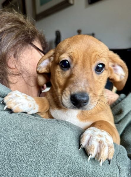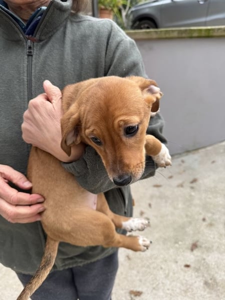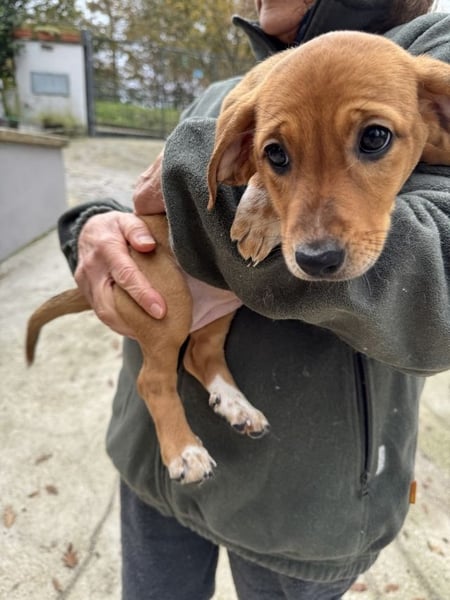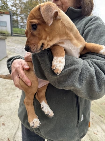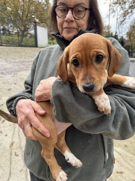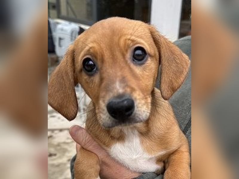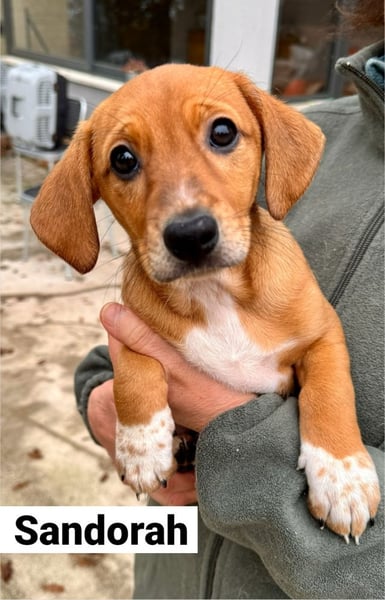 Sandorah, die beim Auffinden noch die Kleinste des Quartetts war, hat in der Zwischenzeit mächtig aufgeholt. Ein rehbraunes Stückchen Zucker, verspielt, neugierig, tapsig, lieb und unbeschwert - kurz zusammengefasst: unwiderstehlich niedlich. Oder einfach so, wie Welpen eben sind. Sandorah ist die einzige im Wurf, die keine weiße Zeichnung im Gesicht trägt, dafür hellbraun gepunktete weiße «Söckchen».
