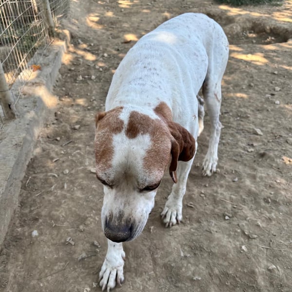 Dabei ist Odysseus ein unglaublich sanfter und freundlicher Hund. Er versteht sich mit allen Artgenossen, liebt Streicheleinheiten und kommt immer wieder selbstständig zu den Helfern, um Nähe zu suchen. Anfangs ist er noch vorsichtig und unsicher, doch schon nach kurzer Zeit taut er auf und zeigt, wie verschmust und anhänglich er ist. Für Odysseus suchen wir nun ein liebevolles, ruhiges und erfahrenes Zuhause - Menschen, die ihm Geduld und Sicherheit geben und ihn Schritt für Schritt in den Alltag integrieren. Er ist ein typischer Pointer mit einem hohen Maß an Sensibilität, Loyalität und von großer innerer Stärke. Wer ihm Vertrauen schenkt, bekommt einen treuen Begleiter fürs Leben. Odysseus ist ein Hund, der trotz allem Leid niemals aufgegeben hat und der es endlich verdient, wirklich anzukommen. Er hört auch ohne Ohrmuschel ganz normal, da der Gehörgang und das Innenohr intakt sind. Es ist lediglich eine optische Besonderheit, die seinem freundlichen Wesen keinen Abbruch tut.