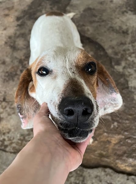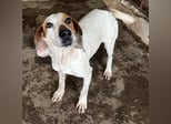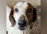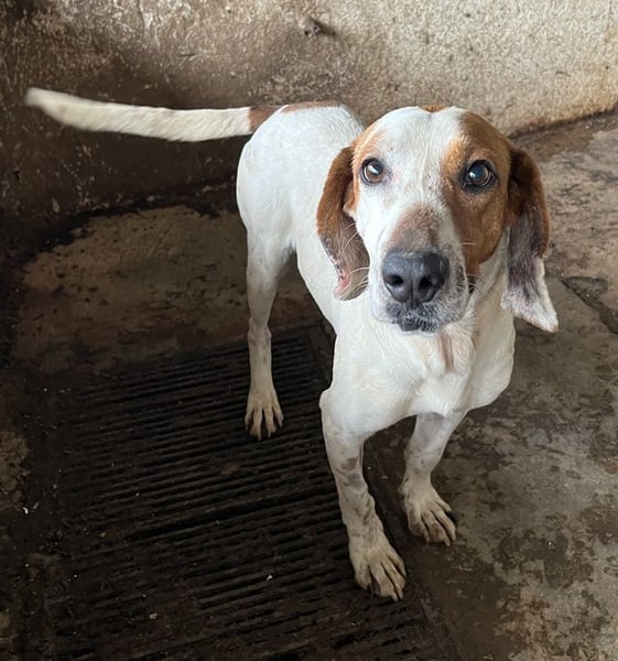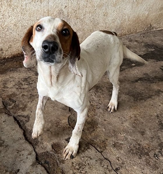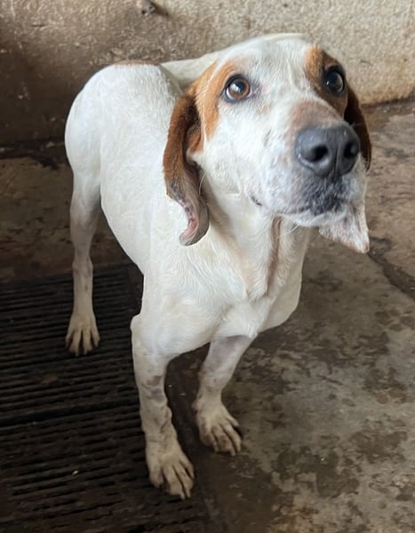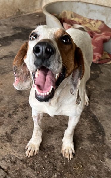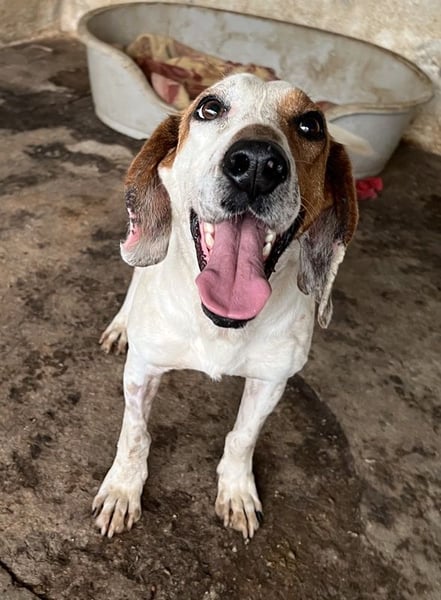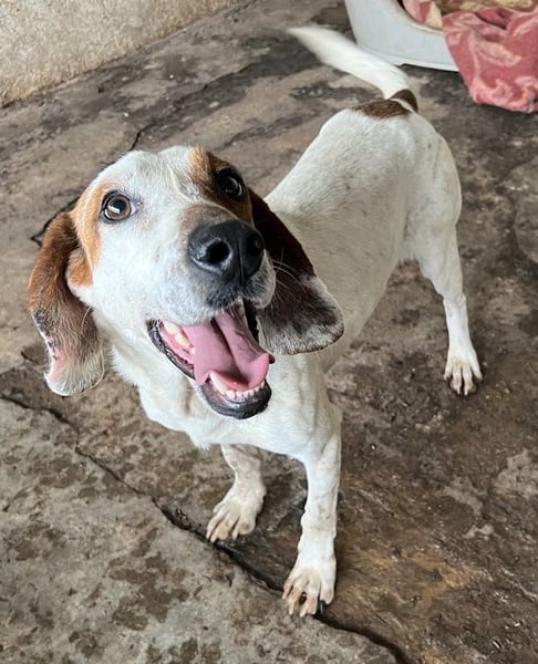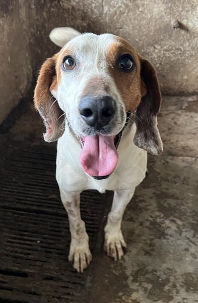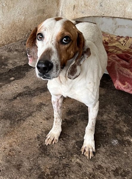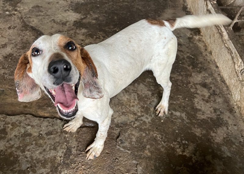 Zack ist ein hübscher Rüde mit kurzem, braun-weißem Fell. Er hat eine angenehme mittlere Größe und große, braune Schlappohren – typisch für einen Jagdhund-Mix.