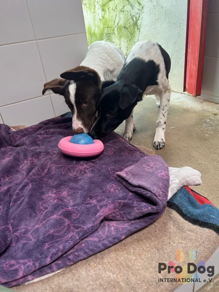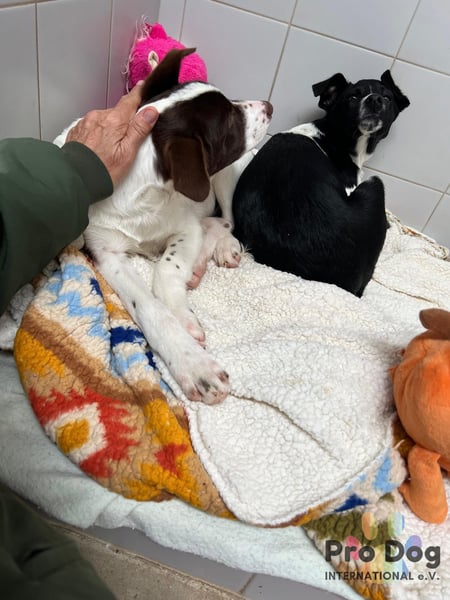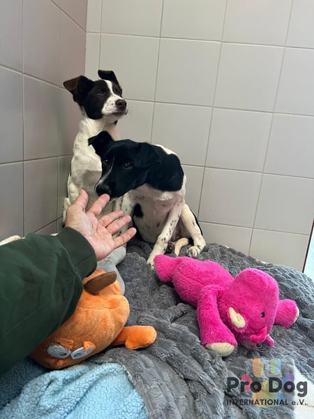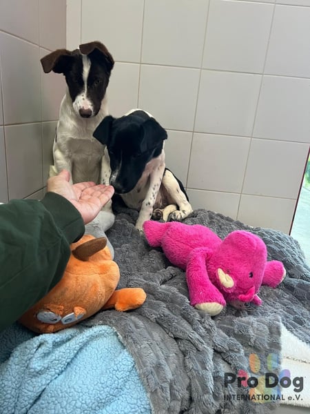 Erfreulicherweise zeigen sie bereits kleine Fortschritte. Die zwei sind mittlerweile mutig genug, um Leckerlies aus der Hand zu nehmen.